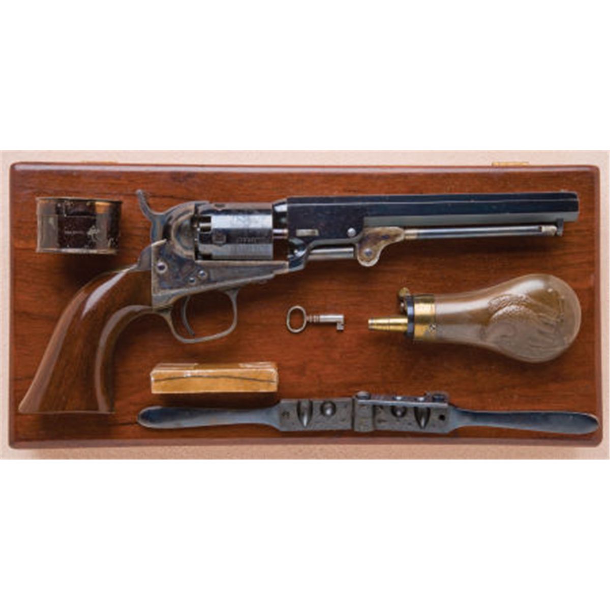 Exceptional Cased Colt Model 1849 Pocket Model Revolver Serial number 157807. .31 caliber, 5-shot cylinder with stagecoach holdup roll scene. 6-inch octagon barrel with brass pin front sight. Top of barrel stampedAddress Saml. Colt/New-York Citywithin brackets. Left side of frame stamped "Colts/Patent." Blued, with case-hardened frame, hammer, and loading lever, with silver-plated brass gripstraps. The grips of varnished walnut.Varnished mahogany case, lined in burgundy velvet. Embossed eagle clutching revolver powder flask, blued steel double cavity bullet mold, tin of Eley Bros. percussion caps with green paper label, miscellaneous round and conical lead projectiles, and key. Wood key plate inlaid on front of case.Literature:R.L.Wilson, American Arms Collectors Percussion Colt's and Their Rivals The Al Cali Collection, pages 28-29.Provenance:From Eastern educational institution, via Greg MartinAl Cali