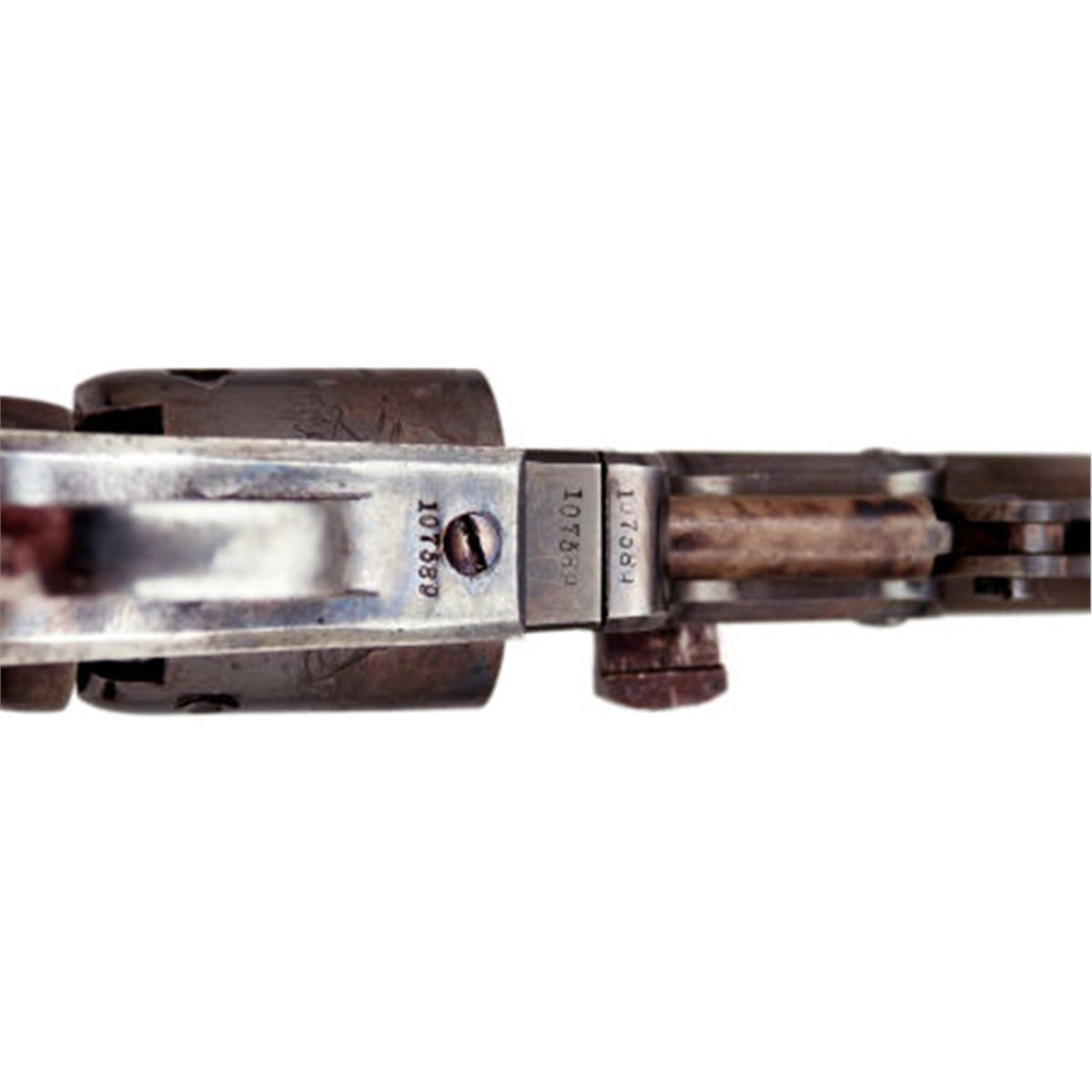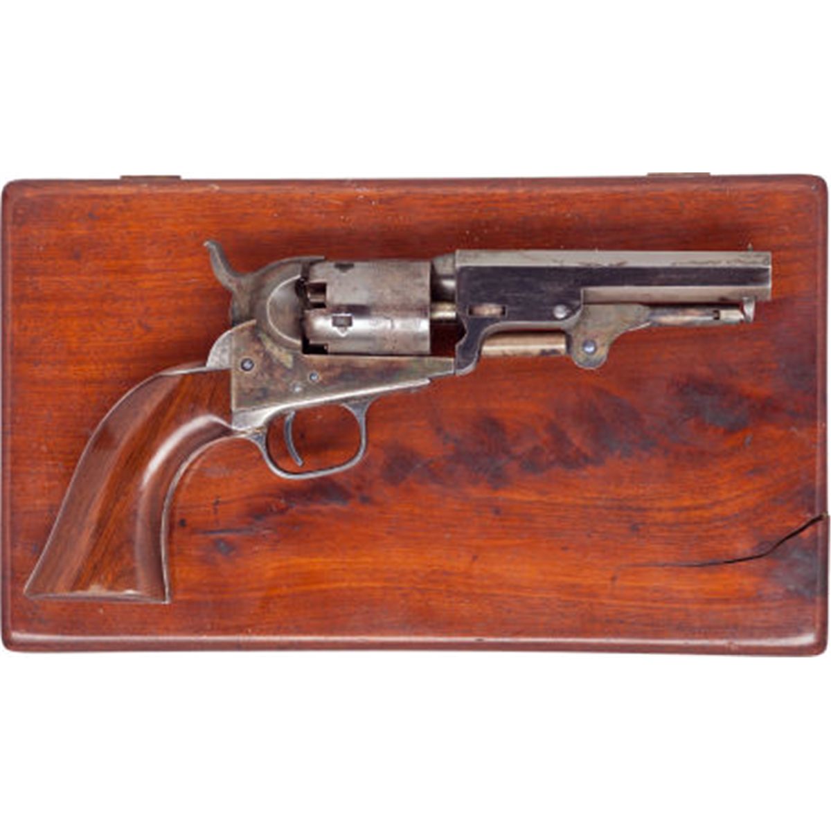 Exceptional Cased Colt Model 1849 Pocket Percussion Revolver. c. 1855 Serial no. 107589, .31 caliber, 4-inch octagonal barrel with two-line New York address. Blued finish. Case-hardened lever, hammer and frame. Stagecoach cylinder scene. Silver-plated brass triggerguard and gripstrap assembly. Contained in original partitioned burgundy velvet-lined factory walnut case, together with eagle powder flask, shellacked block of cartridges, two-cavity bullet mold, screwdriver, ball supply and Cox japanned cap tin. Condition: Excellent. Retaining approximately 90-95% finish with light wear to cylinder and some relief edges. Crisp cylinder scene. Vibrant case-hardening. Silver-plated gripstrap assembly with age patina. Grips excellent. Action crisp. Case with light wear overall. Lining worn at muzzle area. Accoutrements with light wear overall.