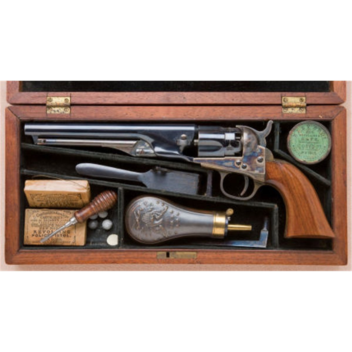 Exceptional Cased Colt Model 1862 New Model Police Revolver Serial number 40859. .36 caliber, 5-shot semi-fluted and rebated cylinder. 6 1/2-inch round barrel with brass pin front sight. Top of barrel stamped with single line Address Col. Saml. Colt New-York U.S. America.Left side of frame marked "Colts/Patent." Blued, with casehardened frame, hammer, and loading lever, with silver-plated brass gripstraps. The grips of varnished walnut.Varnished mahogany case, lined in black velvet. Embossed American eagle and shield powder flask, blued steel double cavity bullet mold with 36P marking on one arm, tin of Eley Bros. percussion caps with green paper label, blued L-shaped screwdriver/nipple wrench, two packets of combustible envelope cartridges by Colt's Cartridge Works, miscellaneous round lead projectiles, and small screwdriver with turned wood handle. Wood keyplate inlaid on front of case.Literature:R.L. Wilson. American Arms Collectors Percussion Colts and Their Rivals The Al Cali Collection, pages 76-77.Provenance:L. Allan CapertonAl Cali