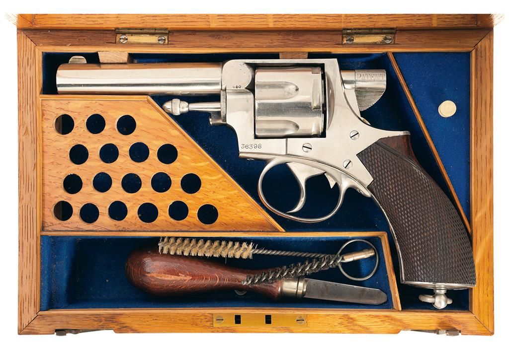 Exceptional Cased Webley Royal Irish Constabulary Double Action Revolver with Rare Silver & Fletcher Expert Patent Ejector and Safety System