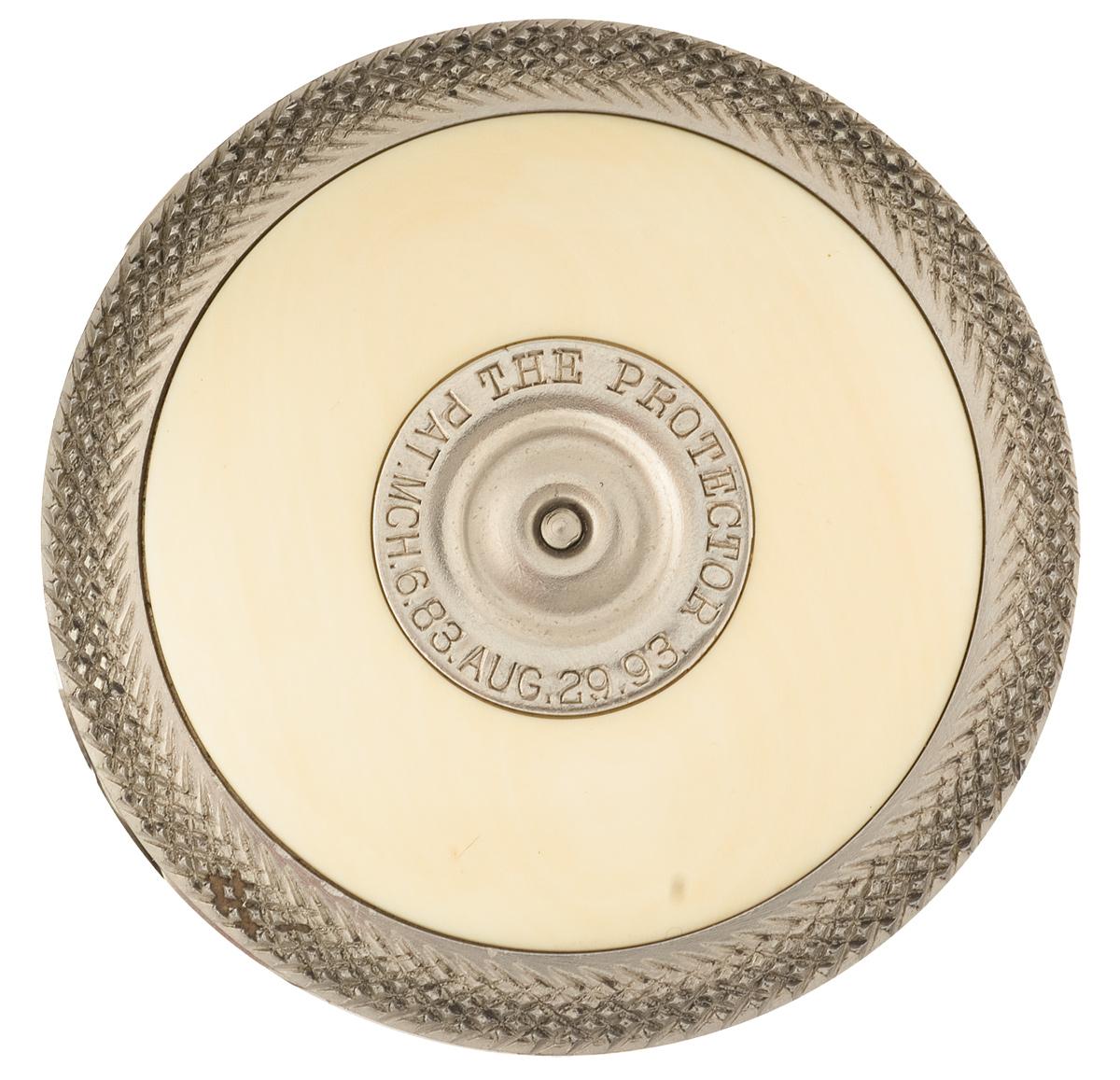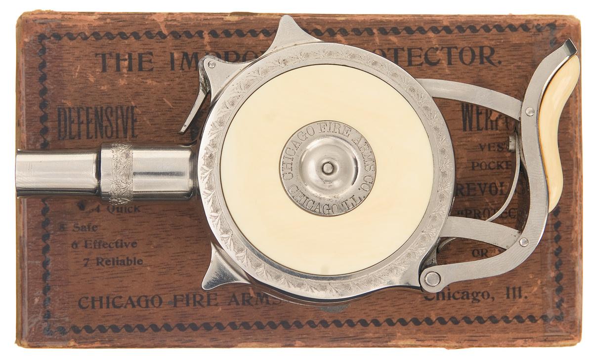 Produced in the mid-1890s, using a radial cylinder and a double action squeeze trigger. Floral engraving around barrel and right side edge of the frame, with checkering on the left side panel. Marked on the right side plate "CHICAGO FIRE ARMS CO./ CHICAGO. ILL." and on the left side "THE PROTECTOR/ PAT. MCH. 6, 83. AUG. 29. 93.". Fitted with a pair of factory smooth ivory panels on either side of the frame and a contoured ivory grip segment on the trigger. Matching numbers on the frame, cylinder and side plate. With a wood grain cardboard box with "IMPROVED PROTECTOR" markings on the lid and instructions for use inside the lid.