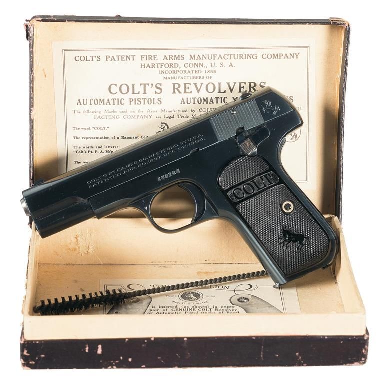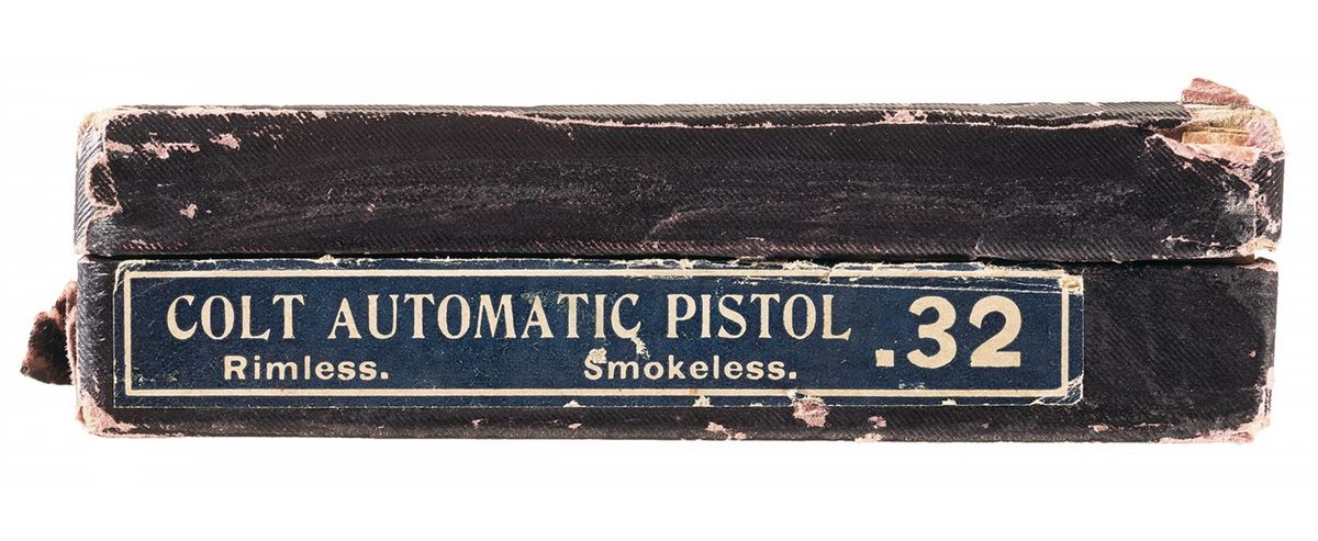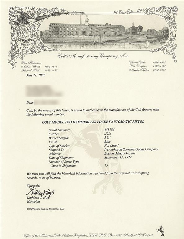 Manufactured in 1924. The left side of the slide is marked with the two-line address/patent dates (1897 & 1903 ) with the Rampant Colt behind the serrations. The right side of the slide is marked, "AUTOMATIC COLT/CALIBRE 32 RIMLESS SMOKELESS" below the ejection port. Blue finished including the barrel with a bright chamber and a two-tone "CAL 32/COLT" marked magazine. Fitted with black hard rubber checkered grips with the COLT banner at the top and the Rampant Colt at the bottom. Complete with the original hinged lid box numbered to the gun containing the original fold-out instruction sheet and cleaning brush. Included is a factory letter stating that this pistol was shipped to Iver Johnson Sporting Goods Co., Boston, Massachusetts, on 12 Sept. 1924.