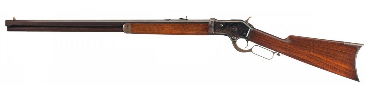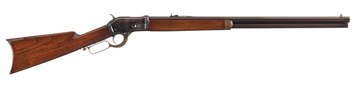 This is an exceptional high condition Colt Burgess lever action rifle. These rifles were manufactured between 1883 and 1885 with only 3,810 rifles total manufactured by the Colt factory making this an extremely rare Colt firearm. This rifle was probably produced in late 1884 or early 1885. These rifles and carbines were Colt's attempt to compete with the Winchester and Marlin firearms, lever action rifles. The top of the barrel is marked with the Colt's two line address/patent dates. The top of the lever loop is marked "BURGESS'S PATENTS" flanked by Maltese crosses, and the serial number (4442) stamped on the lower tang behind the trigger. It has the standard all nickel front sight blade insert, with an adjustable sporting rear sight. It has a full octagon barrel and magazine, with the all blue Colt high polish finish with a casehardened hammer and lever. It is fitted with a straight grip walnut stock and forearm with a steel crescent buttplate with butt-trap compartment (cleaning rod not included).