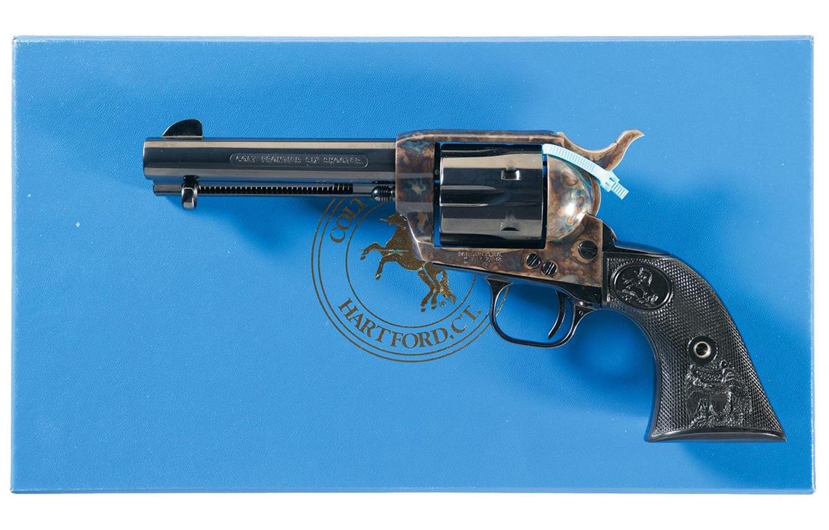 As new in the original box with matching numbers. The inner blue box is like new and the outer white slip cover shows minor light wear on the edges and corners. As noted the end label is intact and the consignor states that this revolver has not been shot or turned since leaving the factory. An exceptional high condition, one of a kind, Colt Custom shop Colt Frontier Six Shooter Cowboy style revolver.