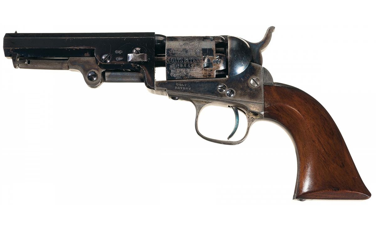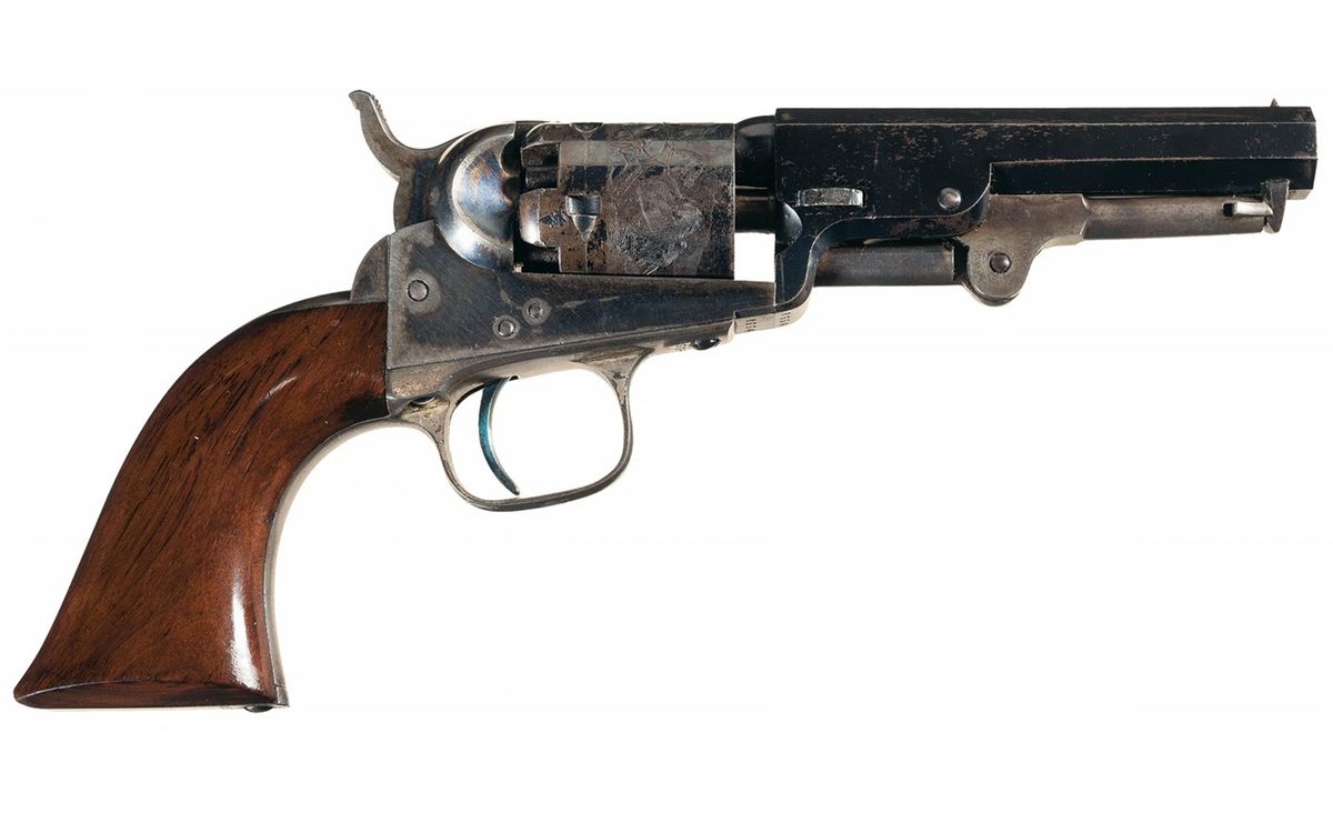 This is an exceptional original example of a Colt Model 1849 Pocket revolver with London address that was manufactured circa 1856. This Fifth Model revolver has the slightly larger grips, steel back strap and oval trigger guard. The revolver has a four-inch octagon barrel with loading lever and five-shot .31 caliber cylinder. The cylinder is roll-engraved with Stagecoach Holdup scene and "COLTS PATENT" markings. The barrel and cylinder have a high polish blue finish, the loading lever, hammer and frame are color casehardened and the trigger guard and back strap are silver plated. The one-piece walnut grip has a high polish piano finish. The top of the barrel is roll-stamped "{ADDRESS COL: COLT/LONDON}". "COLTS/PATENT" is stamped in two lines on the left side of the frame. London "Crown/V" and "Crown/GP" proof and inspection marks are stamped on the left side of the barrel lug in front of the wedge and above each chamber on the cylinder behind the stops. The full serial number "8554" is stamped on the loading lever, bottom of the barrel lug, frame, trigger guard and back strap and on the side of the cylinder. Colt's London Armory manufactured approximately 11,000 Model 1849 Pocket revolvers between 1853 and 1856.