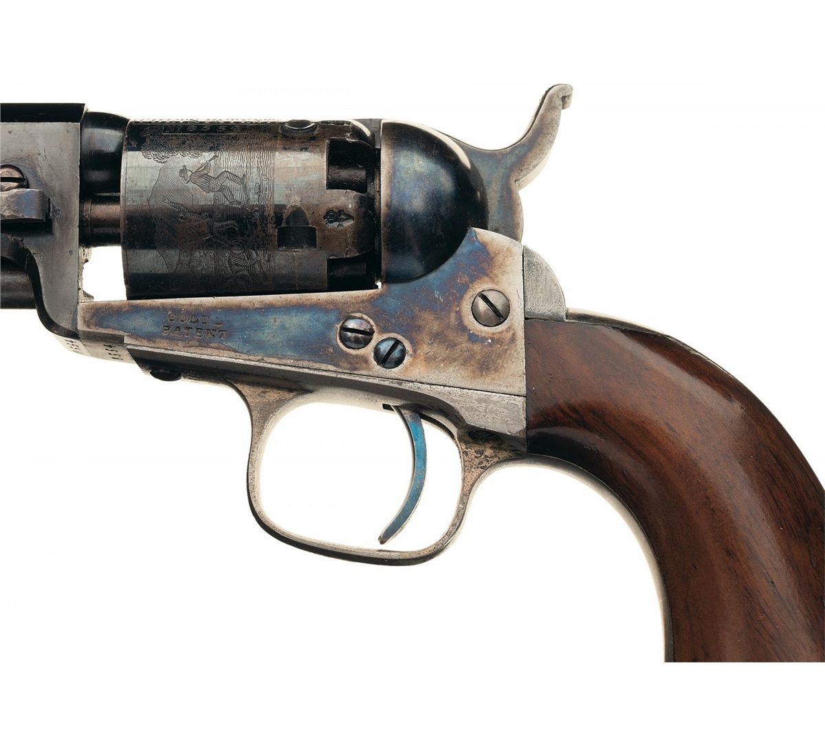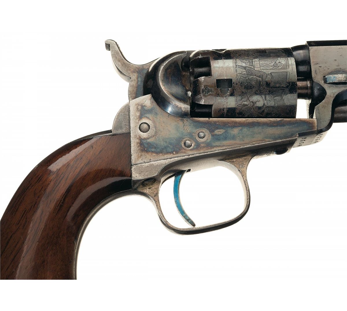 Excellent. The revolver retains 95% of the bright original high polish blue and 95% plus fiery case colors. Nearly all of the blue finish is present on the barrel with wear limited to some finish loss on the edges and several shallow dents on the right side of the lug around the wedge slot. The cylinder retains 80% of the blue finish and nearly all of the Stagecoach Holdup scene. All of the cylinder pins remain intact and flash-pitting on the rear face of the cylinder and percussion nipples is minimal. The loading lever, frame and hammer have at least 95% of the vivid case colors and show minimal wear. The trigger guard and back strap retain 80% of the silver plated finish with light tarnish. The grip is excellent with nearly all of the high polish varnish and minimal wear. All of the markings are sharp. The action is tight and functions perfectly. This is both an attractive and excellent original example of a London Model 1849 Pocket Revolver.