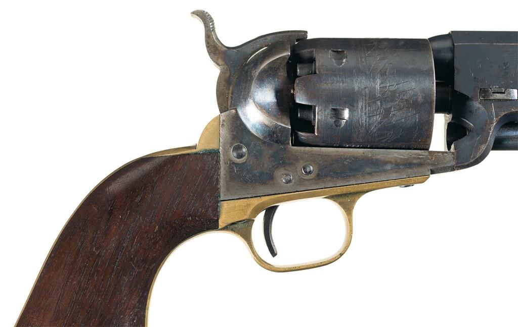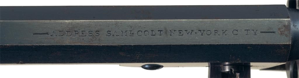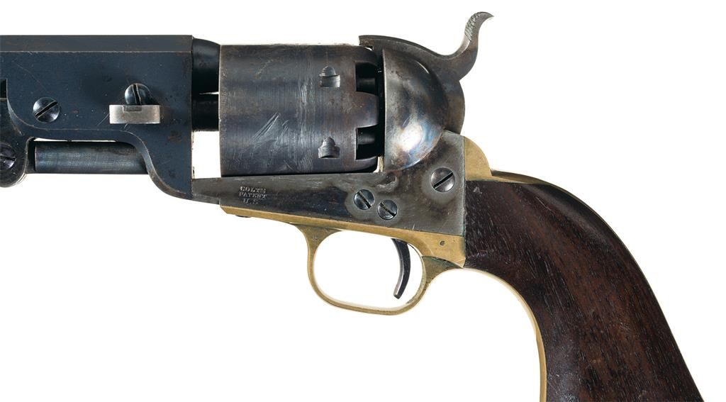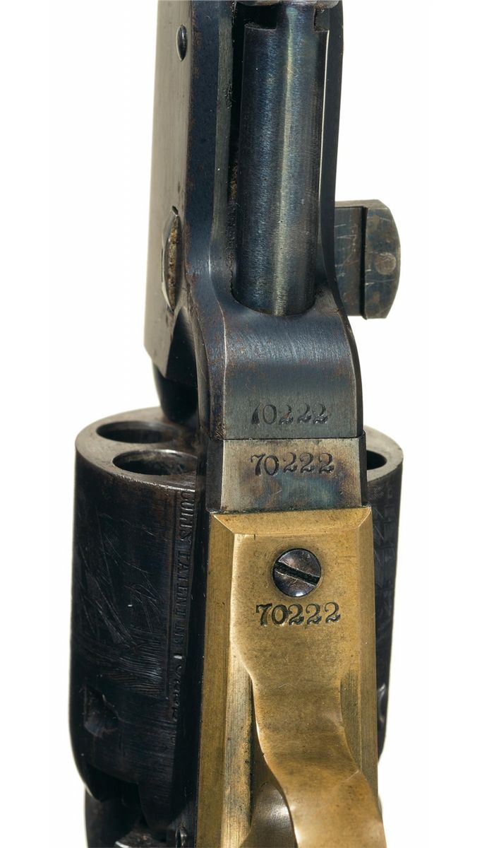 This is an extraordinary example of a Colt Model 1851 Navy revolver that was manufactured in 1857. This revolver has the Third Model Navy features which include: (1) small rounded trigger guard, (2) loading lever screws that enter from the left side, (3) beveled loading cut-out in the barrel lug and (4) recoil shield with no capping channel. This revolver falls within the serial number range of the 18,250 Model 1851 Navy revolvers purchased by the Ordnance Department for the Army between 1857 and 1858. These Army/Navy revolvers had a subdued military blue finish on the barrel and cylinder, casehardened hammer, frame and loading lever and brass trigger guard and back strap. The one-piece walnut grips had a oil finish. This revolver has the standard Army/Navy finish with single letter Ordnance sub-inspection marks on the barrel, cylinder, trigger guard, back strap and grips. "U.S." is stamped in small letters on the left side of the frame beneath the two-line "COLTS/PATENT" marking. The grip is not stamped with Ordnance sub-inspection and final inspection mark on the left and right heel. Lack of these markings may indicate that this revolver was a contract over-run gun. The top of the barrel is roll-stamped "-ADDRESS SAML COLT NEW-YORK CITY-" in one line. The cylinder is roll-engraved with the Texas Navy battle scene and "COLTS PATENT No.". "ENGAGED 16 MAY 1843" is roll-engraved around the front edge of the cylinder. The full serial number "70222" is stamped on the bottom of the barrel lug, frame, trigger guard and back strap and on the side of the cylinder. The loading lever is stamped with the partial serial number "0222". All of the visible serial numbers match.