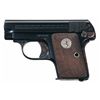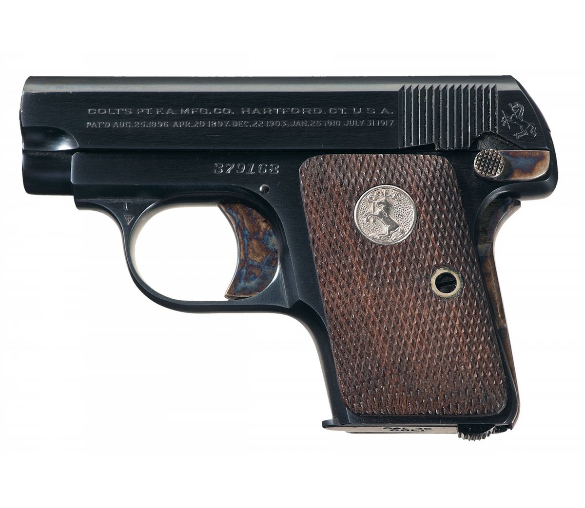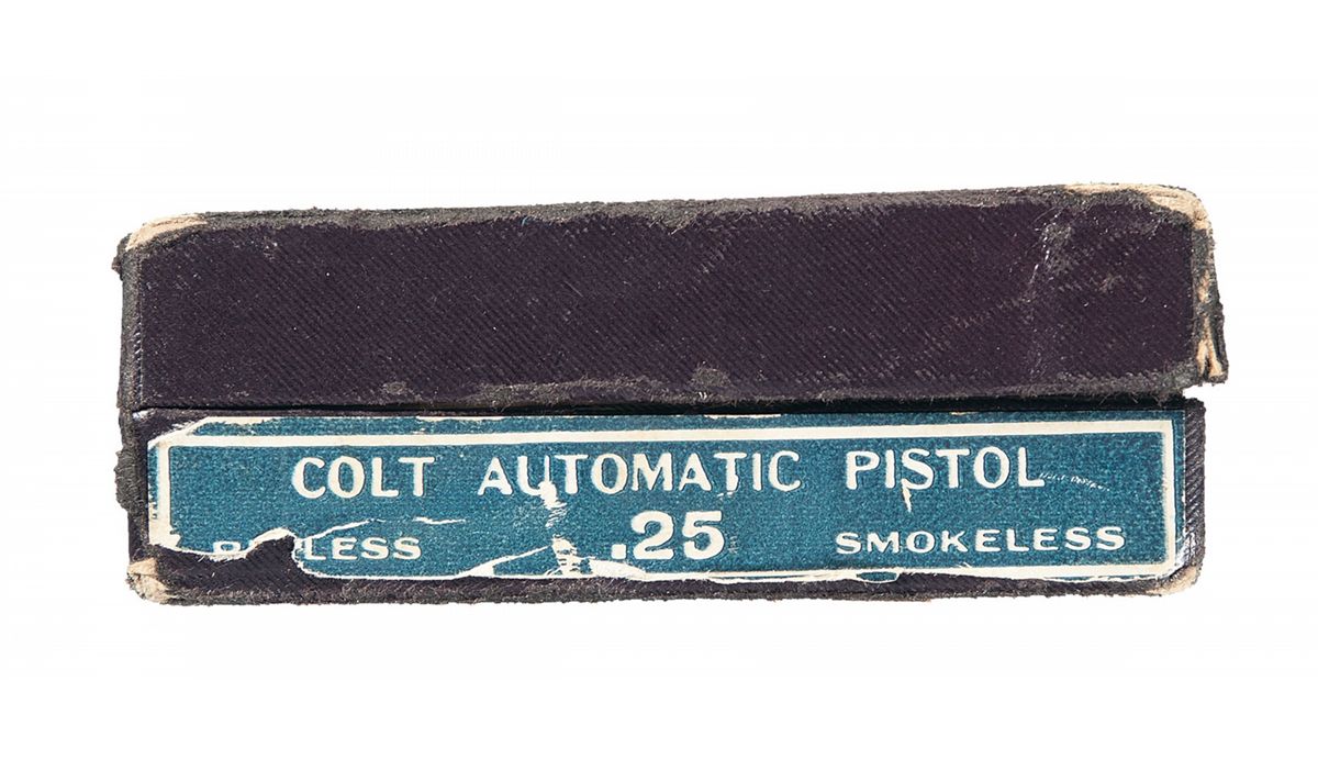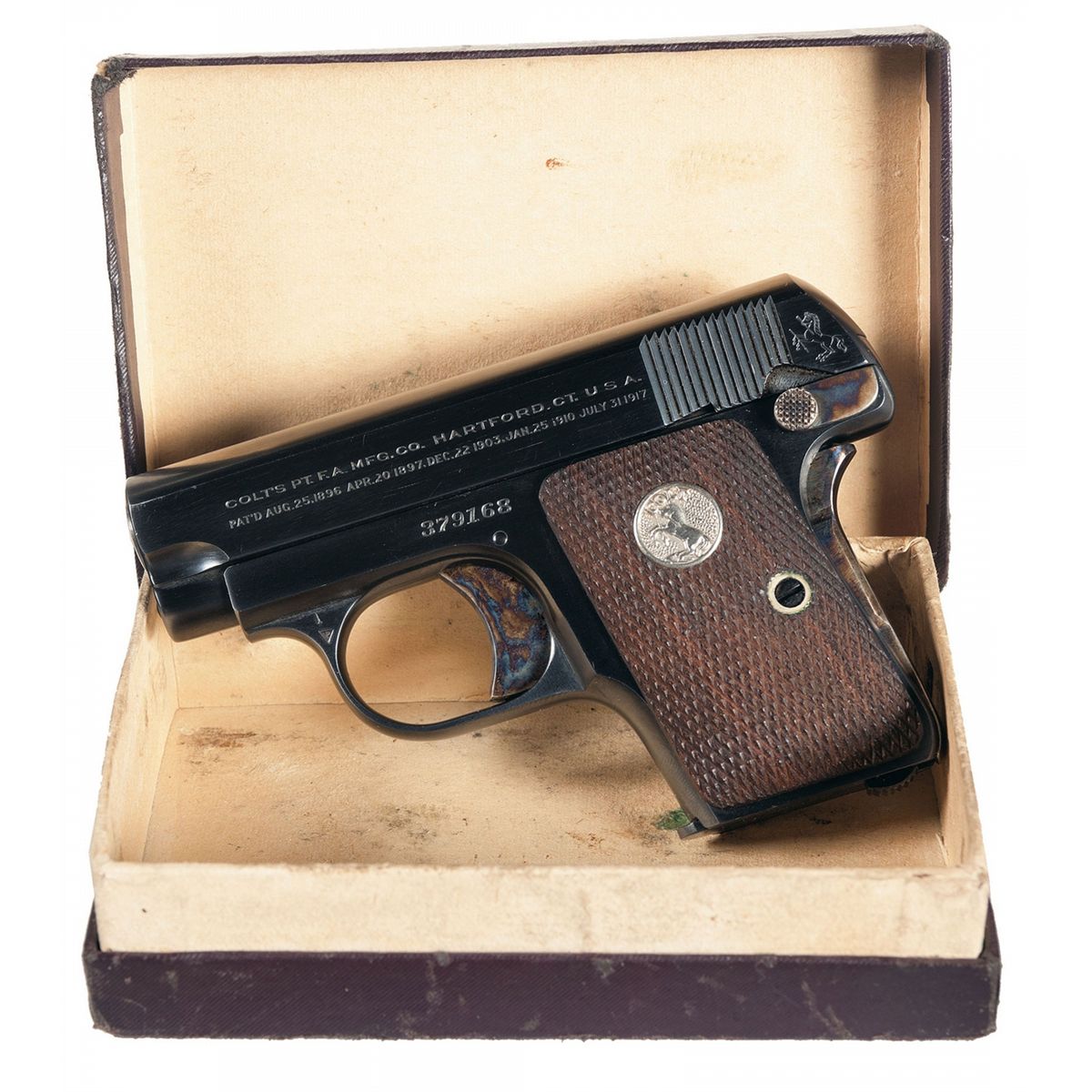 Manufactured in 1929. Standard two line address/patent dates marking with the Rampant Colt behind the serrations on the left side of the slide, serial number on the left side of the frame, and "COLT AUTOMATIC/CALIBRE 25" on the right side of the slide. Casehardened grip safety, thumb safety and trigger. Colt marked two-tone magazine and fitted with checkered Colt medallion grips. Complete with factory box numbered to the gun.