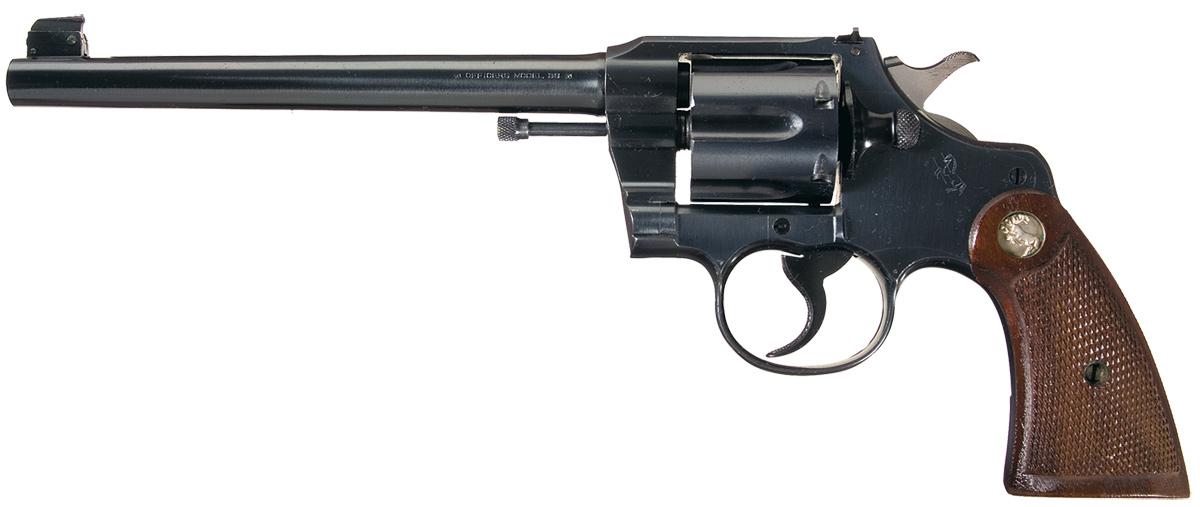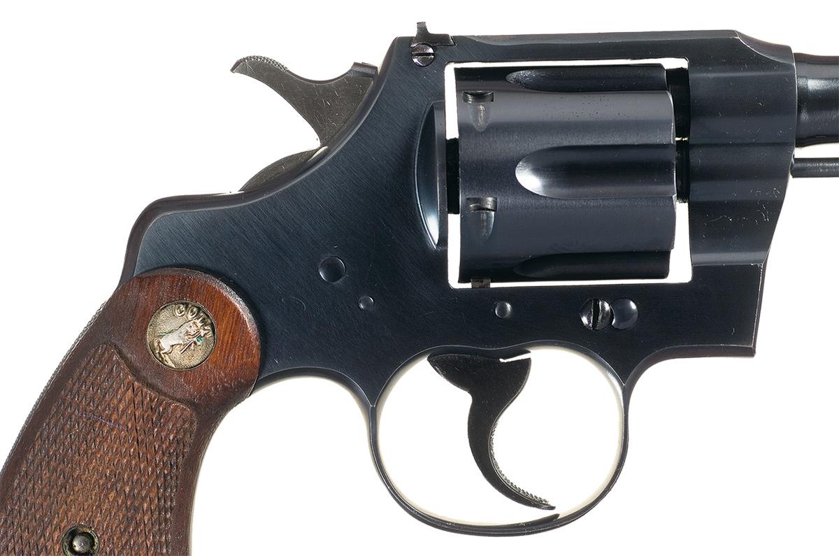 Manufactured in 1923, with elevation adjustable blade front and windage adjustable rear sights, two line address/patent date marking on the top of the barrel and the left side marked "OFFICERS MODEL 38" flanked by Maltese crosses. The Rampant colt is marked on the left side plate and the front and rear top of the trigger guard are marked with the "VP" proof and "3" respectively Fitted with checkered grips with silver Colt medallions.