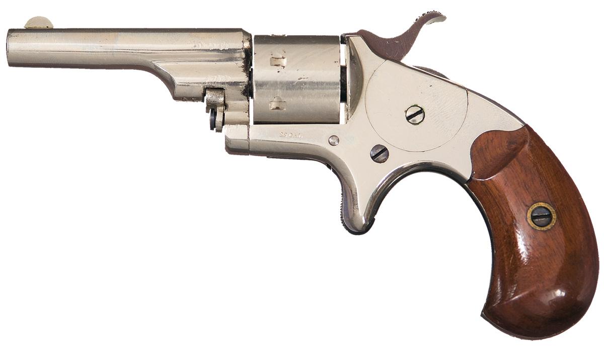This ejectorless model was manufactured in 1877, The top of the barrel is marked with the two line address flanked by Maltese crosses and the left side of the framer below the cylinder is marked "22 CAL". The matching serial number is marked on the bottom of the barrel lug and on the butt. Half moon front and hammer notch rear sights and fitted with smooth two piece varnished walnut grips.