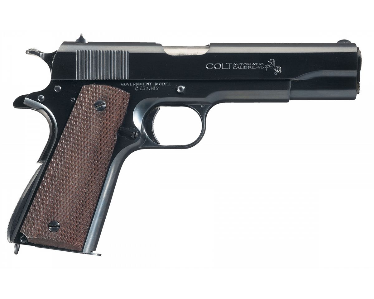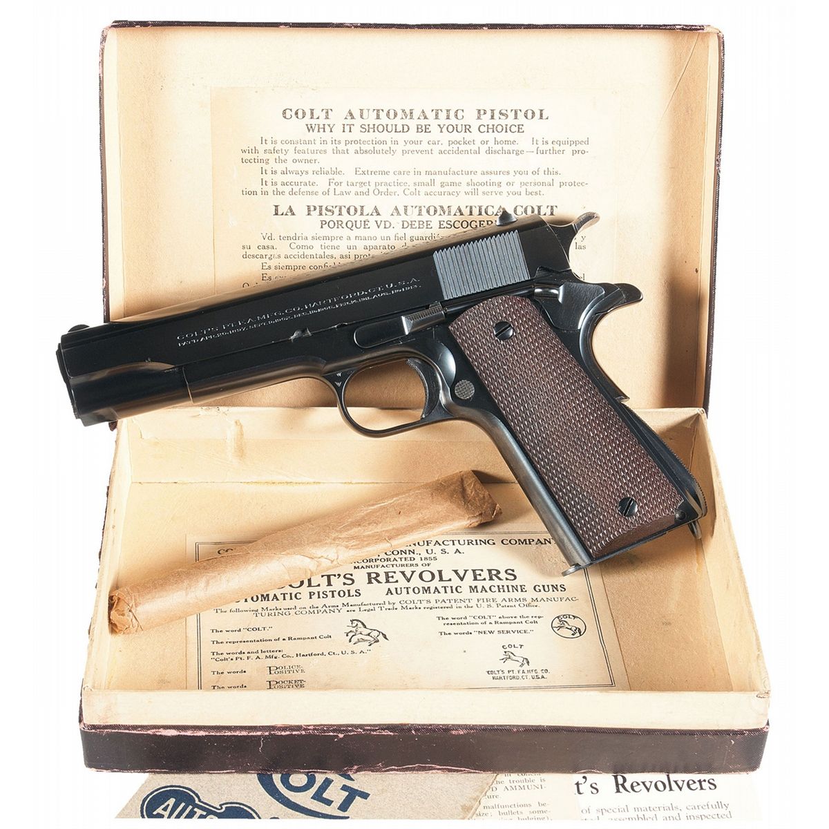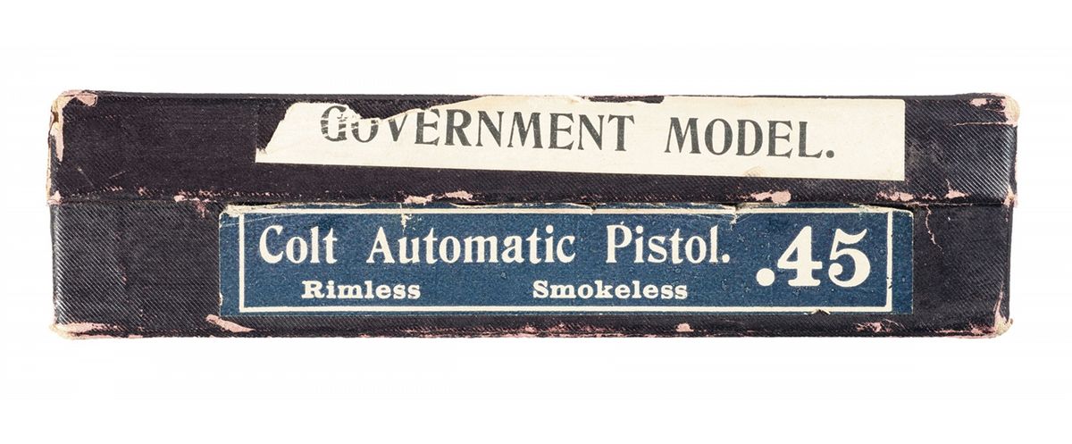 This boxed Colt Government Model .45 Automatic Pistol was manufactured in 1927. The pistol has the original Colt commercial blue finish. The top of the barrel chamber is polished bright and the full-checkered walnut grips are oil finished. The pistol has an unmarked, two-tone, flat base magazine. The pistol displays the feature incorporated by the Ordnance Department with the Model 1911A1 Automatic Pistol in 1923 and adopted by Colt in "New Style" Government Model production in 1924 that include: (1) arched mainspring housing, (2) extended grip safety, (3) short trigger with checkered face and (4) finger clearance cuts on the sides of the receiver. The right side of the receiver is roll-stamped: "GOVERNMENT MODEL/C151303" in two lines behind the slide stop hole. The left side of the trigger guard bow is stamped with a "W" assembler's mark above the Colt "Triangle/VP" proofmark. A "G" is stamped on the top of the receiver to the right of the disconnector hole. An "S" is stamped on the underside of the barrel in front of the lug. The slide is stamped with the serial number "151/303" above and below the firing pin hole beneath the firing pin stop. The right side of the slide is roll-stamped: "COLT AUTOMATIC/CALIBRE.45" followed by the Rampant Colt trademark. The left side of the slide is roll-stamped with the elongated, two-line, Hartford address and 1907-1913 patent dates. The pistol is complete with the original royal blue cardboard carton. The underside of the carton has the serial number, "151303" written in grease pencil. The end of the lid has a white paper label marked "GOVERNMENT MODEL." and the end of the carton bottom has a blue and white label marked: "COLT AUTOMATIC PISTOL .45/Rimless Smokeless". A Colt English/Spanish promotional label is glued to the inside of the carton lid and an English only label is glued to the carton bottom. The carton contains: (1) A bore brush in the original paper sleeve, (2) "Proper Ammunition" leaflet, (3) Manual for "COLT/AUTOMATIC PISTOL/CALIBER..45/GOVERNMENT/MODEL" and (4) "SPECIAL INSTRUCTIONS" pamphlet.