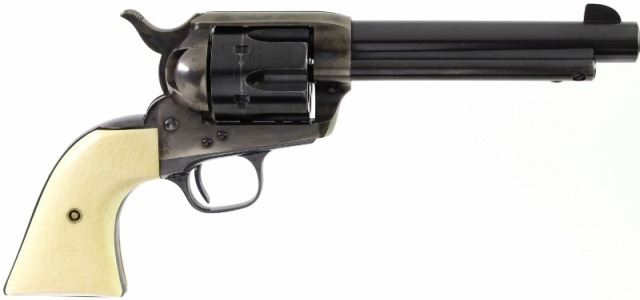 Exceptional Colt SA .38 Spec. SN 352XXX revolvermade in 1928 showing very fine original condition. Revolver blued and case hardened with period ivory grips and 5 1/2" barrel. Tip of muzzle shows very light thinning and loss at front right edge otherwise 98% bright remaining as does ejector housing. Cylinder 98% with drag line between steps trigger guard 99% or better. Frame and hammer display bright case color, period ivory grips are fine. Modern. Est. 5500-7500