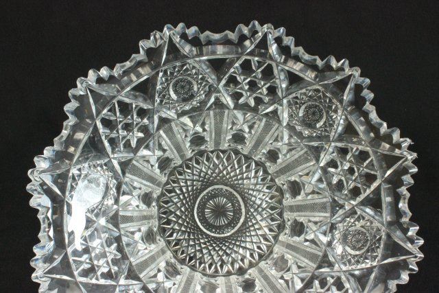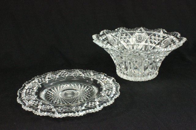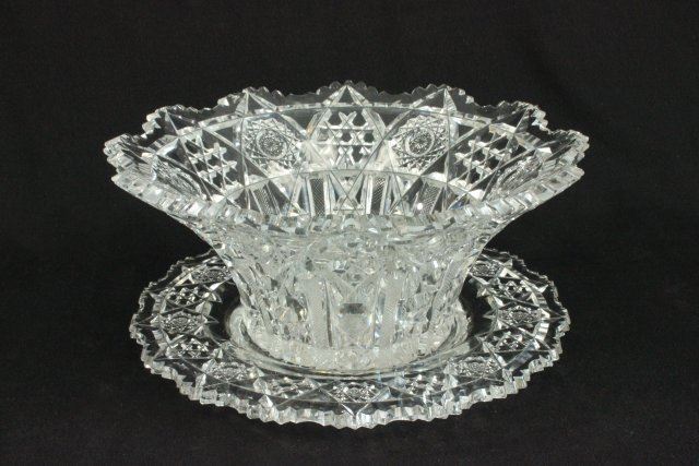 Bowl approx. 5" x 12" D. Underplate approx. 11 1/2" D. Good condition.