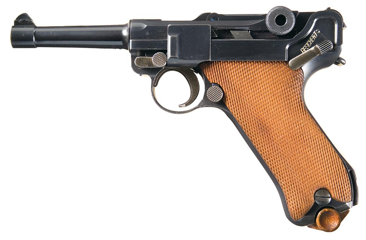 Near new, with 99% plus of the original blue finish, showing a few light handling marks overall. Straw colors and fire blue are 99% plus. Grips are excellent plus. Mechanically excellent. A truly extraordinary example of a DWM commercial Luger.