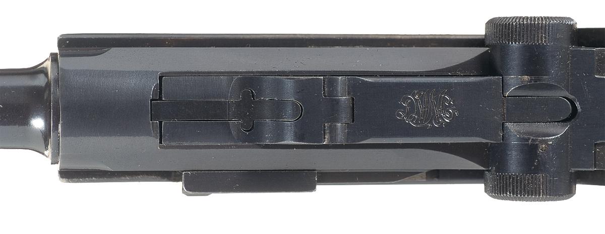 Fixed sights, with the blank chamber and "DWM" monogram on the toggle. "Crown/N" proofs on the left side of the barrel extension, underside of the barrel, and left side of the breechblock. Matching numbers on the barrel and frame, with the last two digits on the latch, side plate, trigger and rear toggle. Straw and fire blue finished small parts, checkered walnut grips and a wood base magazine.