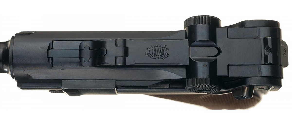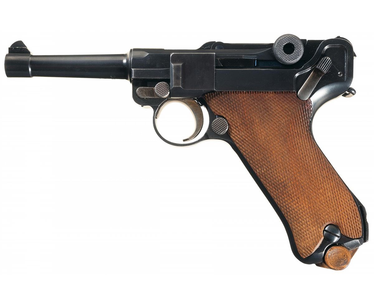 This is a beautiful example of an original early post WWI, 1920 era DWM Commercial Luger pistol. These Lugers are some of the best finished Lugers manufactured by the DWM factory. Although many were reworked military Lugers they were carefully hand polished and refitted with new high quality parts that rivaled the early prewar commercial Lugers. The chamber is blank and the front toggle has the "DWM" monogram. The left side of the barrel extension, left side of the breechblock and underside of the barrel are marked with a "crown/N" commercial proof mark. It is marked in the commercial fashion with the matching serial number (3280o) marked on the front of the frame and underside of the barrel, with the partial serial number "80" stamped on the various other parts; (takedown lever, side plate, trigger, rear toggle) with the remaining parts unnumbered. It has the standard safety and extractor markings with fixed sights. It is fitted with checkered walnut grips, and is complete with a nickel plated magazine body with a wooden base stamped: "GERMANY". It has the blue finish with straw colored small parts. This pistol includes an original steel cleaning rod intended for short barreled Lugers.