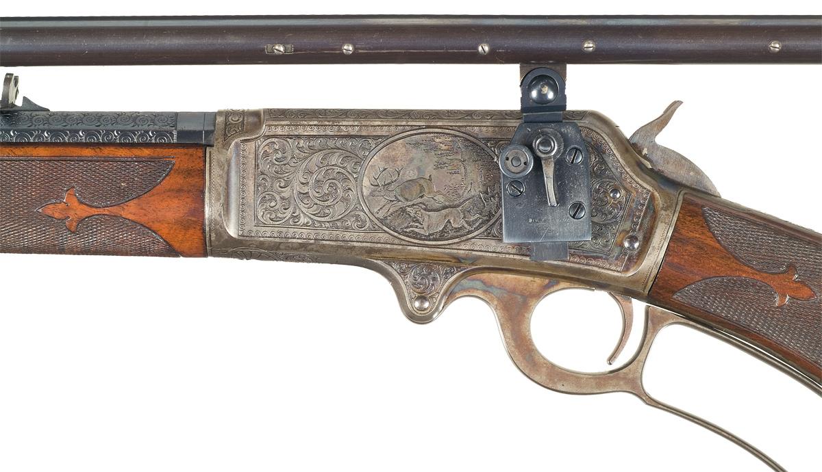 This an exceptional example of a deluxe factory engraved, special order Marlin Model 1893 rifle manufactured circa 1895. This rifle features a 26 inch octagon barrel with full magazine tube, brass blade front sight, adjustable buckhorn rear sight, and is fitted with a period 21 1/2" scope with silver eye piece and cap mounted to the left side of the receiver and to the top barrel flat with Lyman mounts. The barrel and magazine are blue and the remaining parts casehardened. The rifle features unusual special order numbers 5, 10 and 15 engraving. The breech end of the barrel is decorated with a grade 5 scroll engraved pattern. The receiver features engraved floral scroll designs with a punch dot background and scroll bordering. In the center of the left side is a wooded scene of a dog chasing a buck, in an oval panel. The right side has a double circle panel with a bear standing on a rock directly behind the loading gate and the bottom has a feather design directly behind the serial number. The forend cap also features floral scroll and punch dot engraving. In addition the upper left barrel flat just ahead of the rear sight is engraved "Special Steel". The top barrel flat is marked with the standard two line address/patent dates, "32-40" at the breech and "MODEL / 1893" in an oval panel amid the scroll engraving on the upper tang. The rifle is mounted with deluxe fancy Class 3 fleur-de-lis checkered forearm and pistol grip stock with a hard rubber Marlin buttplate. This rifle is pictured ( 4 photos) in Brophy's book "Marlin Firearms" on pages 194 and 195.