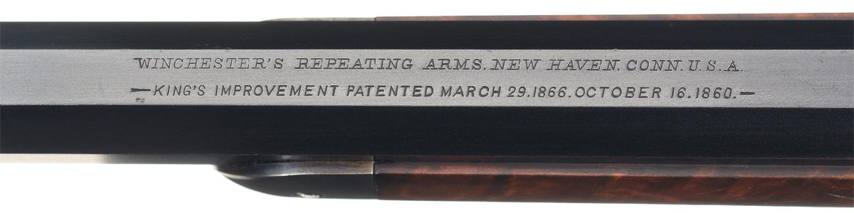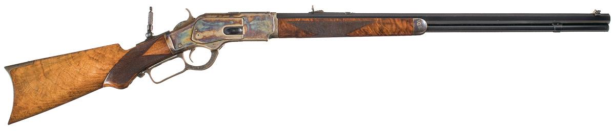 This is a fantastic example of a Deluxe Winchester Model 1873 lever action rifle that was manufactured in 1888. This particular example is a Third Model with the distinctive integral dust cover rail on top of the receiver. The top of the barrel is marked with the two line address/King's Improvement patent dates ahead of the rear sight, "32 W.C.F." at the breech and "32 CAL." on the bottom of the brass cartridge elevator. The tang mounted peep sight is covering the model designation and the serial number on the lower tang. The barrel is equipped with a special order folding globe sight that is adjustable for windage, standard buckhorn rear sporting sight, and there is a mid range tang mounted peep sight. The barrel and magazine tube are blue and the remaining parts are casehardened. The rifle is mounted with deluxe checkered fancy walnut forearm and pistol grip stock with a steel forend cap, black insert in the bottom of the pistol grip and crescent buttplate. This exceptional Model 1873 rifle is from the A.I. McCroskie Collection.