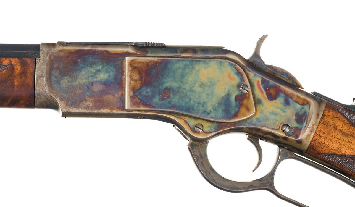 Condition: Excellent plus. The barrel and magazine tube retain 98% of the bright original blue finish with barely noticable muzzle and high edge wear. There is some minor wear on the top barrel flat from adjusting the rear sight and there are a couple of minor dings. 98% plus original finish remains on the dust cover. The remaining parts retain 95% plus original bright case colors with some fading to gray on the front portion of the receiver. The buttplate retains 75% original case colors with the balance having a smooth mellow brownish patina. The wood is also excellent with some overall scattered minor dings and small pressure dents and crisp checkering. The markings are crisp and clear. The action is excellent. This Model 1873 is in unbelievable condition that you have to see to believe. It would be difficult to improve on this rifle.
