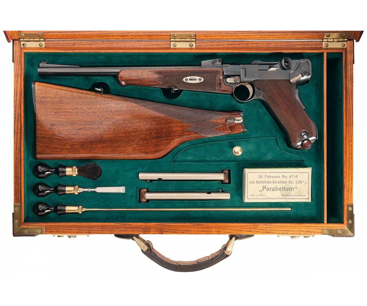 This is a beautiful example of an original DWM Model 1902 Luger carbine rig that is complete with the matching walnut shoulder stock, two spare wooden base magazines, and cleaning equipment all contained in a deluxe leather bound walnut storage/display case made by the Huey gun case company. These carbines were an early attempt by DWM to compete with the stocked Mauser Broomhandle carbines as well as all the other stocked pistols being produced in the later 19th and early 20th century in Europe. The unique feature of these pistols is that they have the longer 11 3/4 inch barrel, with the DWM factory frame hanger that holds the small walnut forend, which houses a unique, small spring accelerator mechanism, inside that is necessary to correctly cycle the heavier/longer carbine length barrel during the cycling phase. All these 1902 Luger carbines have all the very desirable early features such as: the long old style frame, flat mainspring, grip safety, dished toggles with toggle lock on the right side, and the recessed/flat breech bolt with the small spring extractor. The top of the chamber has the prominent "American Eagle" crest and the front toggle has the DWM (Deutsche Waffen und Munitions Fabriken) logo on it. The full serial number (21927) is correctly marked on the underside of the frame extension, and the underside of the barrel, with the last two digits of the serial number (27) is marked on the bottom of the recoil lug, side of the grip safety, trigger, takedown lever, side plate, breech bolt, and toggle assembly. The forend is also correctly numbered (27) inside the cutout for the frame extension and also matches the pistol. The grips are numbered with "9 over 27" on the back sides of each grip. As noted, this fine example of a Luger carbine has the original attaching iron numbered on top (927) that has been fitted with a correct style reproduction walnut stock. The stock itself conforms to the original in the length, configuration, checkering and finish, which has been fitted with a correct style plastic butt plate and original sling swivel. The pistol magazine, as well as the two spare magazines, are all original and have a nickel plated body with the correct wood base. As noted, this wonderful carbine rig is housed in an original style leather bound, red lined French fitted display case. The case itself contains a brass cleaning rod, screw driver and cleaning brush all with turned ebony handles, and one box of original DWM 7.65mm Luger ammunition. The box is marked: "50 Patrone, zum Selbstlade-Karabiner Kal 7.65 m/m Parabellum, Made in Germany" which has a, "A.F. Stoeger" label on the side of the box. The pistol and accessories are all housed in a contemporary case that measures, approximately 21 inches long, by 12 inches wide and features all walnut construction, with brass reinforcing plates on the corners with bras hinges, front locks. The entire case is leather bound in a heavy grade of premium leather with leather reinforced corners and a heavy leather strap handle on the front. Inside the case it has a red felt lining with a gold and black label on the inside the lid that reads: "DWM/Berlin Parabellum-Pistol", and is complete with a heavy cloth outside cover. This pistol was featured in CADA Gun Journal, cover shot, August 1994, and is included. Also, an authentication letter dated Jan. 8, 1998 from noted author Charles Kenyon, is included with lot.