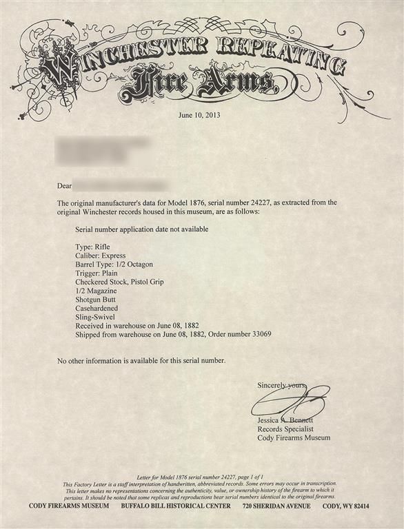 The factory letter describes the rifle as express caliber with 1/2 octagon barrel, plain trigger, checkered stock and pistol grip, 1/2 magazine, shotgun butt, casehardened with sling swivel and states that it was shipped from the Winchester warehouse on June 8, 1882. The half octagon barrel, dust cover and loading gate are blue. The forearm cap, receiver, hammer, lever, and shotgun buttplate are casehardened. The extra finish walnut forearm and pistol grip stock have Style H checkering with a low luster oiled finish. The bottom of the stock pistol grip has an ebony insert. The Second Model receiver has a screw fastened dust cover guide rail and a dust cover with serrated edges. The barrel has a dovetail mounted Winchester Express front sight and a folding leaf rear sight marked "1876" at the top of the leaf. A folding Lyman Combination Tang Peep Sight with "JAN.26.79" patent date is factory mounted on the upper tang. The forearm cap and stock are fitted with factory sling swivels. The top of the barrel is roll stamped with the two line legend "WINCHESTER'S-REPEATING ARMS. NEW HAVEN. CT../KING'S-IMPROVEMENT-PATENTED-MARCH 29. 1866. OCTOBER 16. 1860." ahead of the rear sight. "50-CAL." is stamped on the top barrel flat ahead of the receiver. The top of the dust cover is marked "WINCHESTER EXPRESS/50 CAL. 95 GNS." in two lines. "50-95" is stamped in script numerals on the brass cartridge elevator. The serial number, "24227" is stamped in small numerals across the lower tang behind the lever latch.