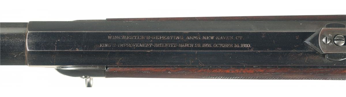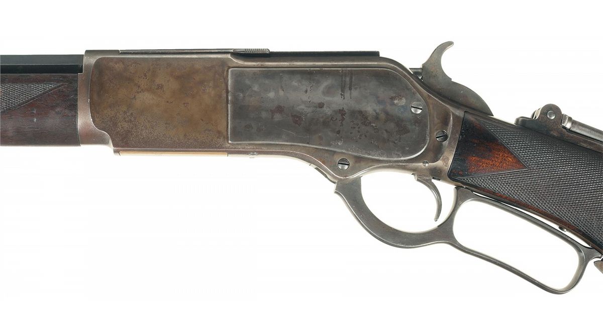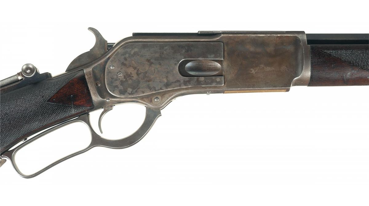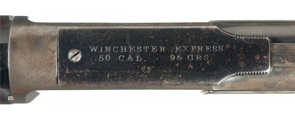 Very fine. The barrel has 85% of the blue finish intact with some light edge wear on the high points and muzzle and a small area where the finish has lifted on the upper right side. The dust cover and loading gate retain at least 85% of the bright blue finish. The forearm cap, receiver, hammer and lever have 60% plus of the casehardened finish intact. The case colors have faded slightly. There are several small spots of shallow pitting on the left side of the receiver and side plate. The buttplate has about 80% of the muted case colors intact. The brass cartridge elevator has a mellow untouched patina. The markings on the barrel and dust cover are crisp. The stock and forearm are very good. The checkered panels show light handling wear with scattered scratches on the stock and forearm. This is an exceptional example of a scarce Deluxe Special Order Winchester Model 1876, .50 Express rifle.