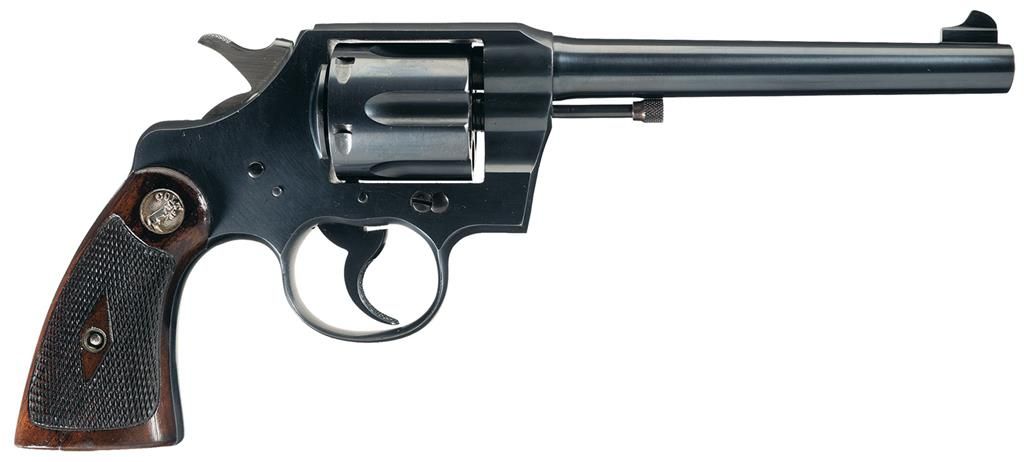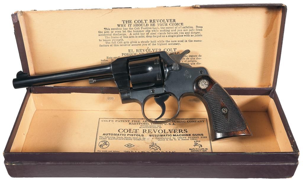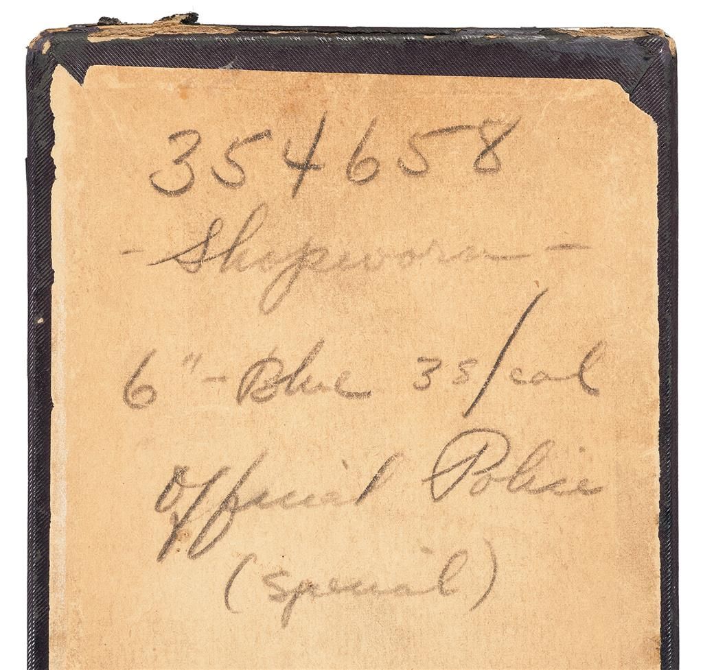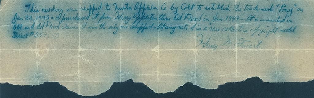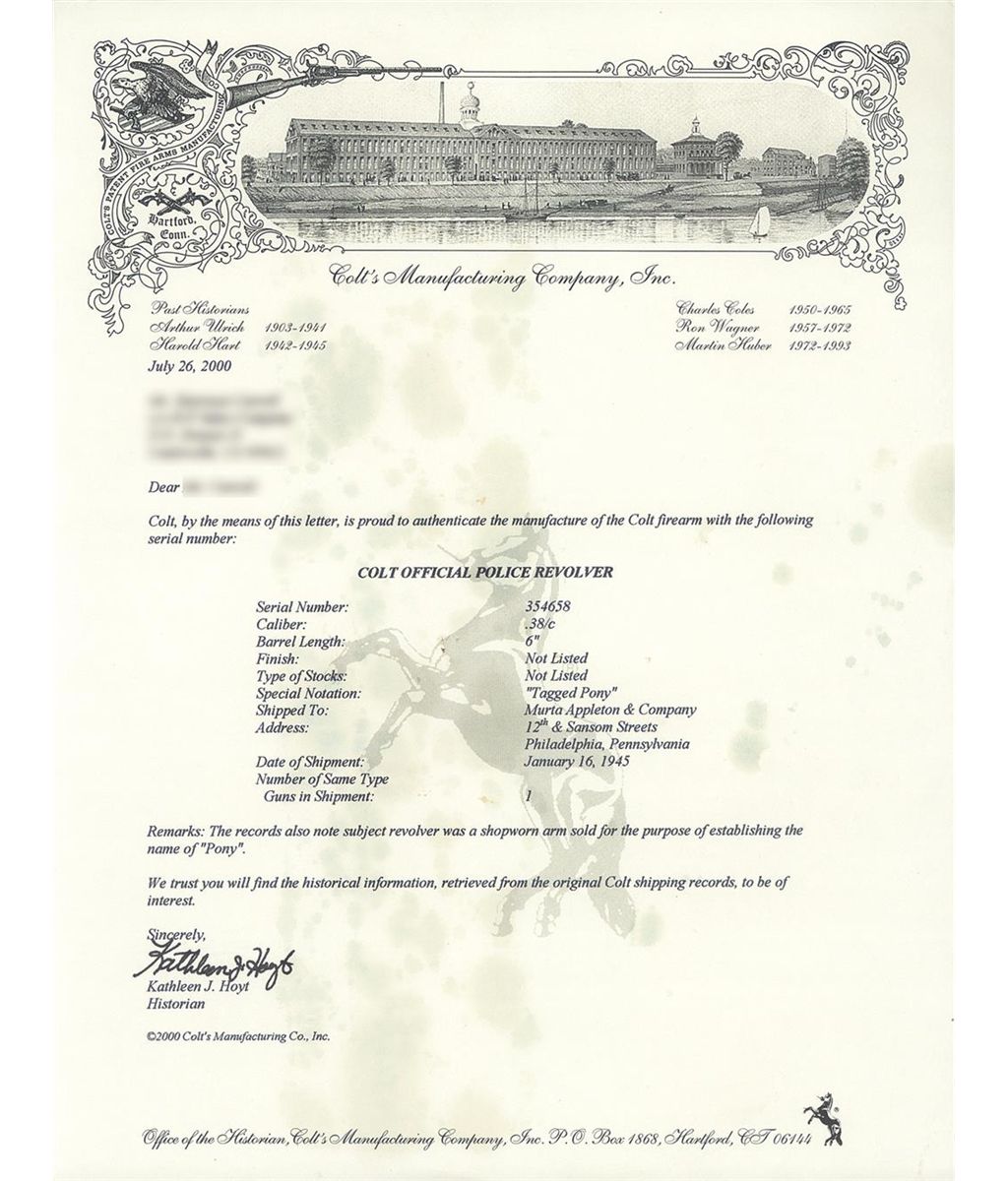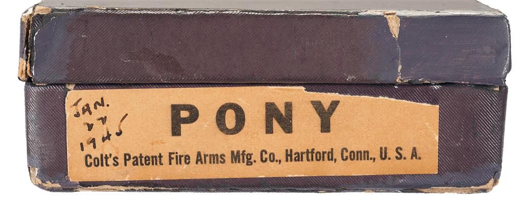 This is an excellent example of an extremely rare Colt "Pony" revolver that was manufactured in 1945. This revolver is pictured, identified by serial number and briefly described on page 347 of "The Book of Colt Firearms" by Wilson and Sutherland and was once in Robert Sutherland's collection. The revolver is nearly identical to an Official Police revolver and was considered "Shopworn". It was intended to renew the registration of the "Pony" name for Colt's exclusive use. The Pony name is not on the revolver, however when it was made a green tag marked "Pony" (not included), was attached and the proper governmental papers were filed. The Pony Model was patented on January 22, 1945. This model names marked on Colt firearms are registered and copyrighted by the factory prior to manufacture. This revolver has no barrel markings, has the Rampant Colt on the left side of the frame, the matching serial number is marked on the frame and crane, and the Colt triangle "VP" proof and the number "7" assemblers number on the front and rear, left upper side of the trigger guard respectively. The barrel is fitted with a blade front sight that sloops downward at the rear and has a stippled rear face, and it has the standard square notch rear sight in the top strap. The revolver has an all blue finish , polished hammer sides and checkered trigger, cylinder release and hammer spur. Fitted with checkered walnut grips with silver Colt medallions. The accompanying factory letter verifies the serial number, caliber, barrel length, with finish and grips as "Not Listed", special notation "Tagged Pony" and that it was shipped as 1 to Murta Appleton & Company, 12th & Sanson Streets, Philadelphia, Pa. on January 16, 1945, where it was to have the Pony trademark established. Remarks on the factory letter state "The records also note subject revolver was a shopworn are sold for the purpose of establishing the name of "Pony"." Interesting enough the Colt Pony is a .380 semi-automatic pistol introduced in 1997. The revolver is complete with the original maroon hinged lid box with end label that reads "PONY/Colt's Patent Fire Arms Mfg. Co., Hartford, Conn., U.S.A." and hand written notation "JAN./22/1945". The bottom of the box is marked in pencil "354658/Shopworn/6"-Blue 38/cal/Official Police/(special).