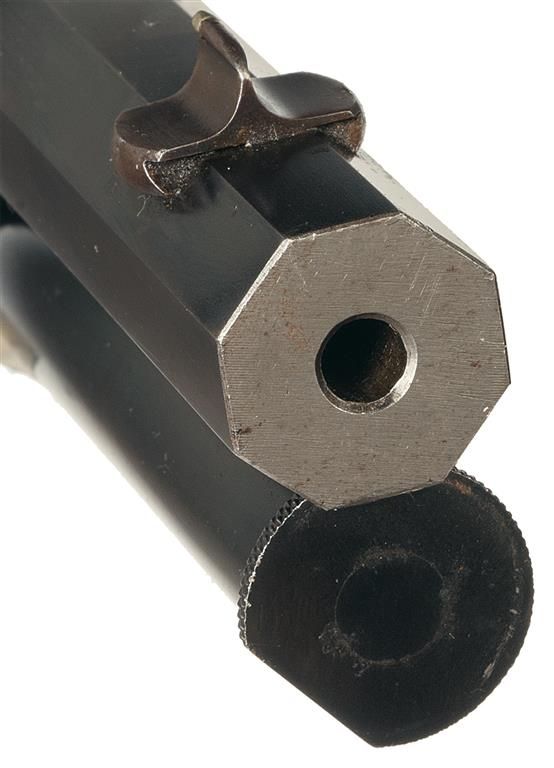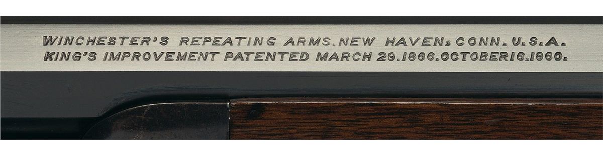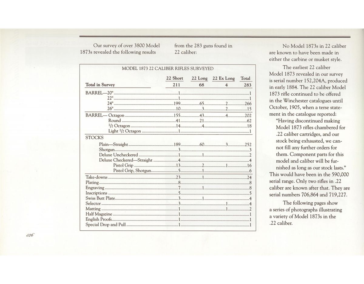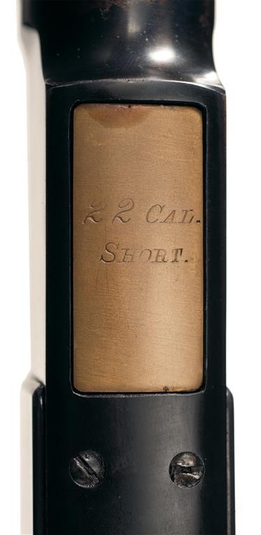 This is a very fine example of a Winchester Model 1873 lever action rifle that is chambered in the desirable .22 short rimfire caliber. This rifle was manufactured in circa 1923, the last year of production after the model was declared "obsolete" around serial number 702,000 and is the highest known serial number Model 1873 .22 rifle and is discussed on page 526 of "Winchester New Model of 1873, A Tribute, Vol.II" by James Gordon. The rifle has the distinctive .22 caliber receiver with no loading gate and front loading magazine with late pattern magazine tube. Third Model receiver has an integral dust cover guide and dust cover with serrated edges. The upper left barrel flat ahead of the rear sight is marked "WINCHESTER'S ARMS. NEW HAVEN. CONN. U.S.A./KING'S IMPROVEMENT PATENTED MARCH 29. 1866. OCTOBER 16. 1860." ahead of the rear sight and "22 SHORT" at the breech. The bottom of the cartridge elevator is marked "22 CAL./SHORT." in script letters. The serial number is marked on the lower tang. Blade front, adjustable sporting rear sights. Blue finish with casehardened hammer, lever and buttplate, and mounted with a smooth walnut forearm with steel end cap and straight grip stock with crescent buttplate. The Winchester Model 1873 rifle was the first Winchester .22 caliber rifle and the first .22 caliber repeating rifle manufactured in the United States.
