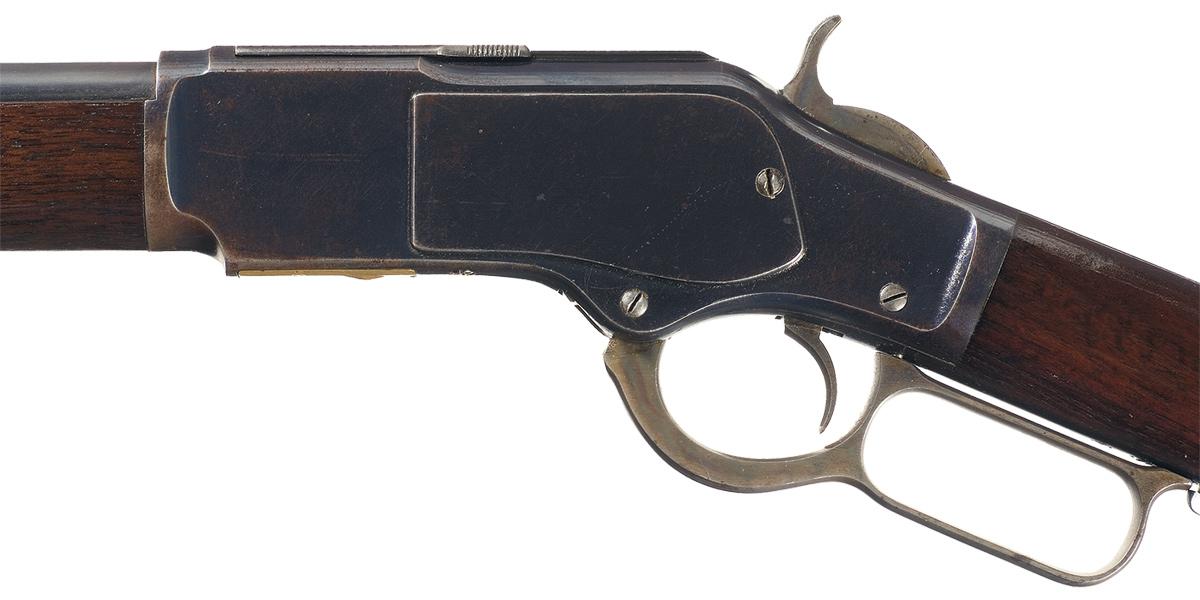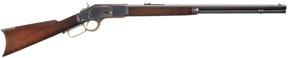 Condition: Excellent. The rifle retains nearly 95% of the original blue and casehardened finish. The barrel, magazine and forearm cap have most of the original blue. Finish wear on the receiver is concentrated on the high points and edges of the side plates. The loading gate and rear sight have nearly all of the fiery niter blue finish. The hammer and loading gate retain most of the original case colors; the casehardened finish on the buttplate is thin with a silver-gray patina. All the barrel and receiver markings are crisp. The bore is bright. The stock and forearm are in excellent condition with most of the original varnished finish and only minor handling wear. This is an exceptional example of a Third Model 1873 Winchester Sporting Rifle.