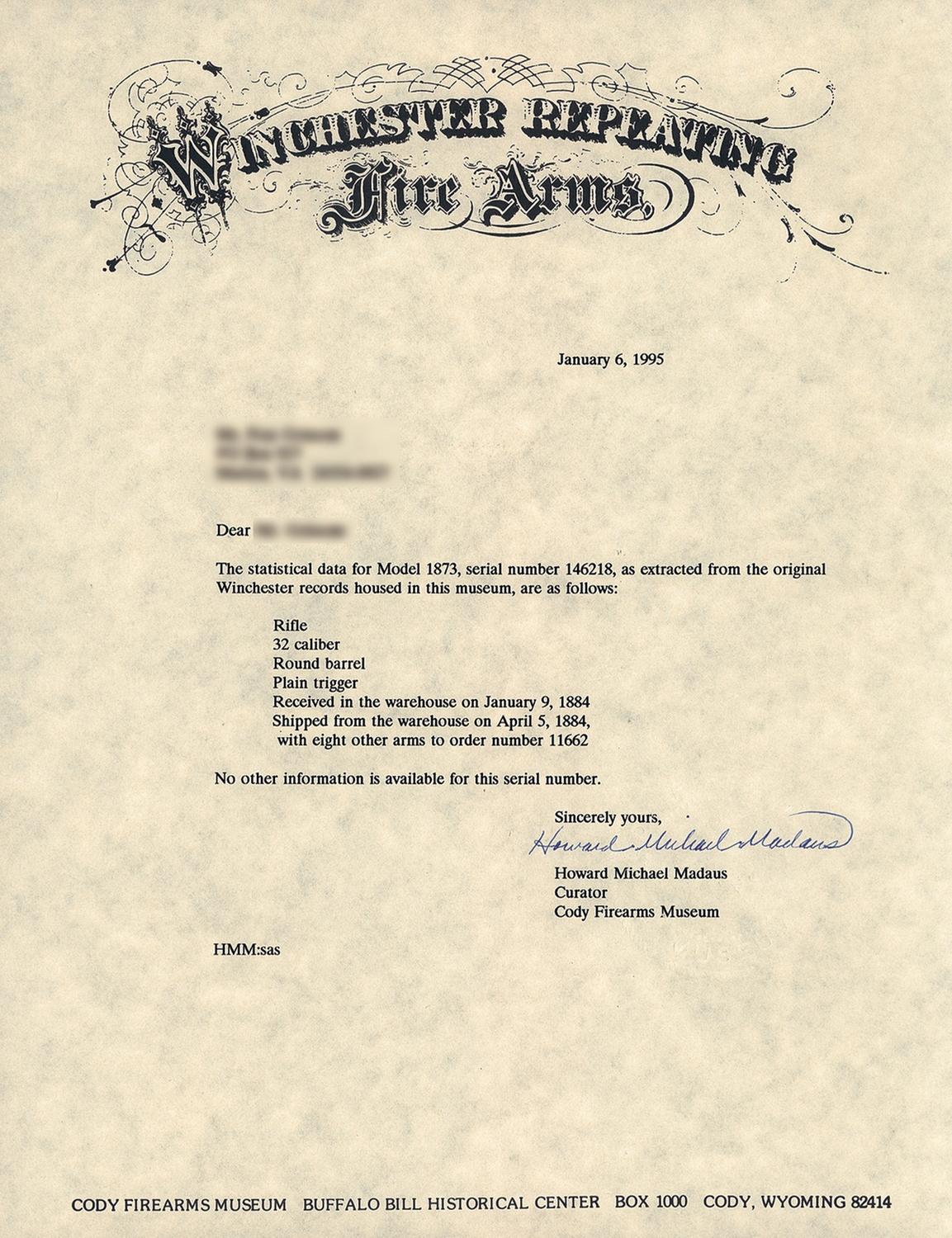 Winchester Third Model 1873 Sporting Rifle with Cody Firearms Museum letter. The Cody Firearms Museum letter states that this rifle was shipped from the Winchester warehouse on April 15, 1884. The letter describes the rifle as "32 caliber" with "Round barrel" and "Plain trigger". The rifle has a round barrel, full length magazine with varnished walnut stock and forearm and solid crescent steel buttplate. The barrel is fitted with a fixed front sight with nickel-silver blade and sporting style rear sight. The receiver has an integral dust cover rail and the dust cover has seriated edges. The barrel, magazine tube, forearm cap and receiver are blued. The hammer, loading lever and buttplate have a casehardened finish. The rear sight and loading gate are niter blue. The hammer spur has course checkering with distinct borders. The receiver tang is factory drilled and tapped for a tang sight. The top of the barrel is roll-stamped: "WINCHESTER'S-REPEATING-ARMS. NEW HAVEN CT./KING'S-IMPROVEMENT-PETENTED-MARCH 29.1866. OCTOBER 16.1860." in two lines. "32-CAL" is located on the top of the barrel just ahead of the receiver. "32 CAL" is inscribed on the bottom of the brass cartridge elevator. The upper receiver tang is roll-stamped: "{ MODEL 1873}" in fancy letters with foliate decorations on either end of the marking. The serial number, "146218A" is inscribed on the lower receiver tang behind the loading lever latch.