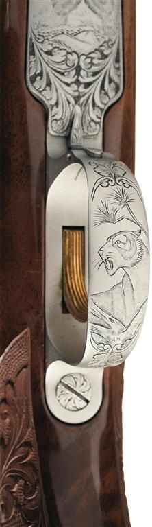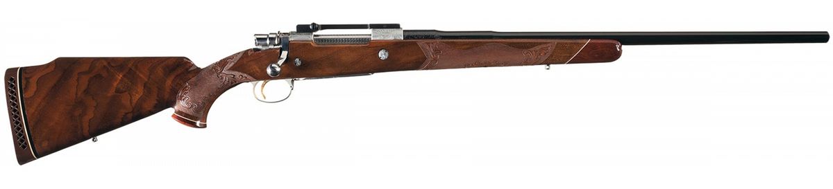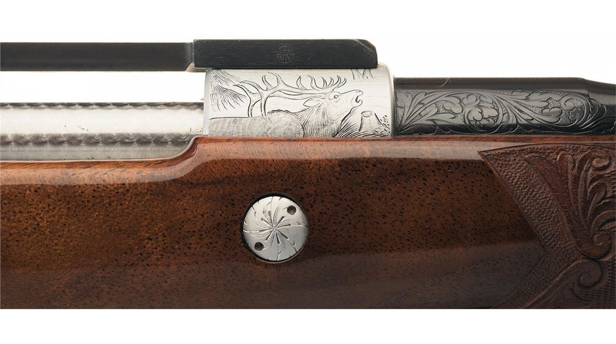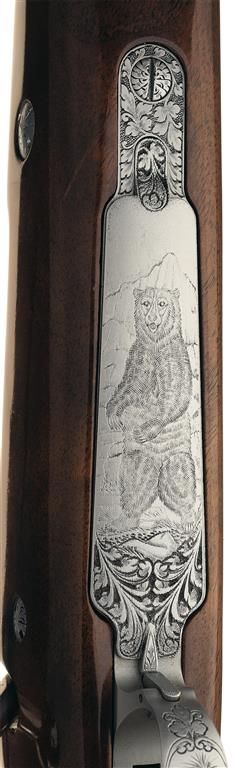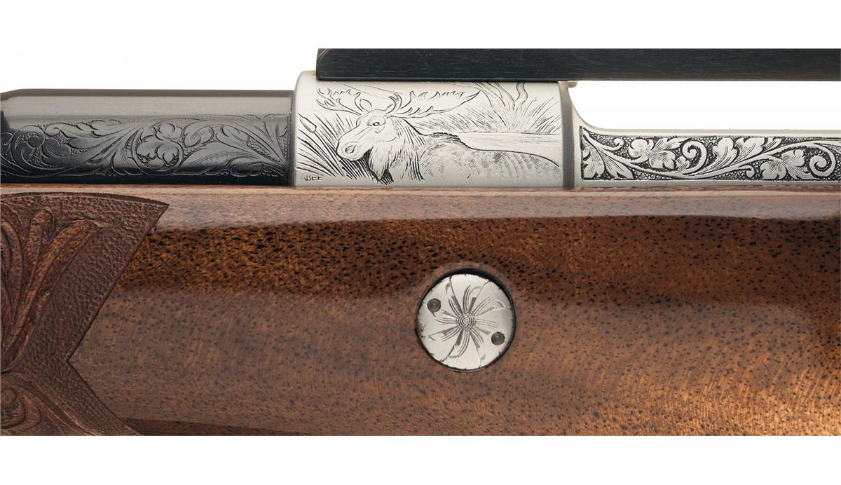 This extensive game scene engraved Belgian rifle features a blue barrel manufactured without provisions for sights and French gray finish on the remaining parts. The breech end of the barrel is decorated with floral scroll engraving on the sides. The bolt assembly is jeweled and the trigger is gold washed. There is a Redfield scope rail mounted on the receiver. The front receiver ring is engraved with a bugling elk on the right side, a moose on the left side and the remainder of the action is relief floral vine leaf and punch dot engraved. The reported serial number is not visible. The hinged floor plate engraved with a standing bear in a mountain scene and there is a mountain lion on the trigger guard which is also signed "AM". The left side of the front receiver ring is signed "ABEE". The screw heads and stock bolts are also engraved with a leaf design. The stock is extra fancy select walnut with a high gloss finish, fine line checkering and floral and punch dot hand carving on the forearm and grip area, contrasting forend and grip cap with a diamond shaped brass insert on the grip cap, raised comb, cheekpiece, vented Browning recoil pad and sling swivel studs.
