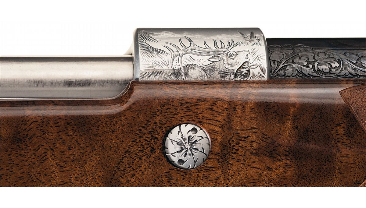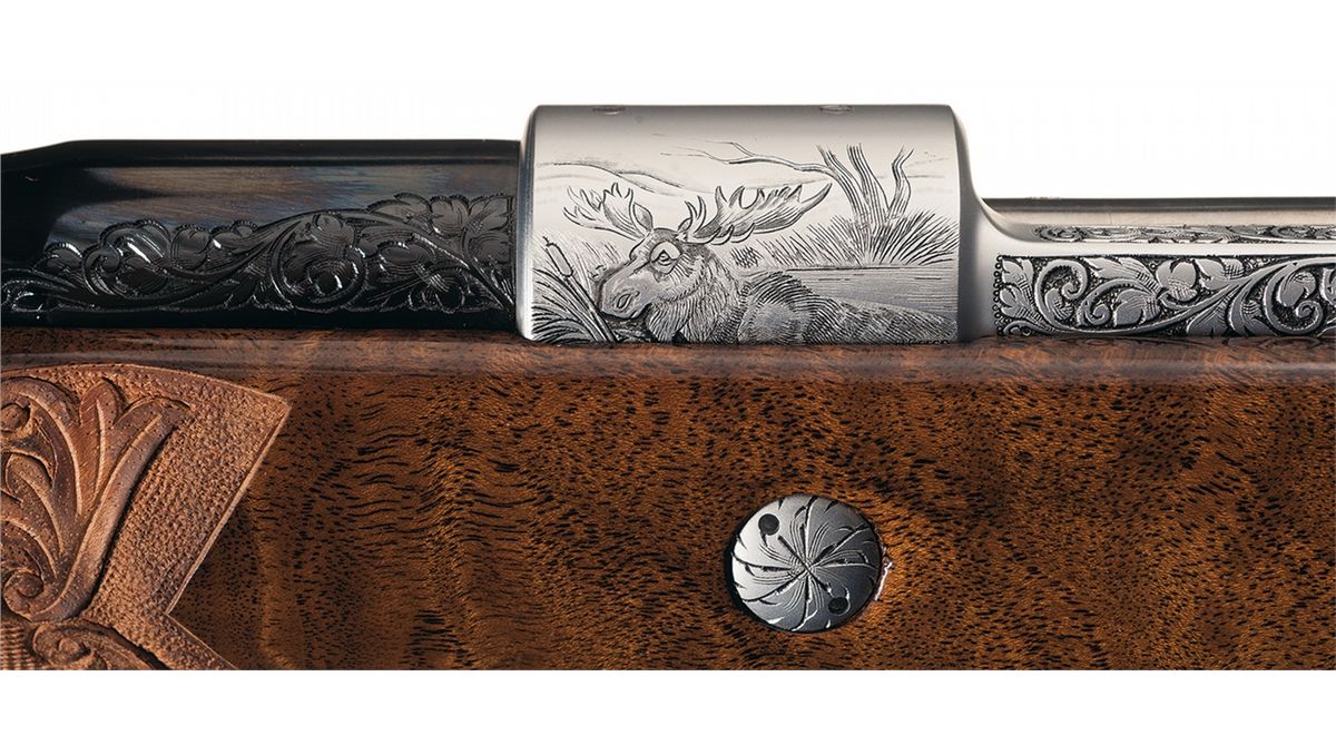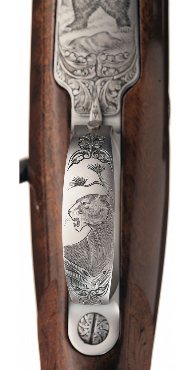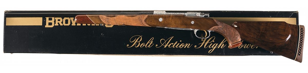 Manufactured in Belgium in 1970, this extensive game scene engraved rifle features a blue barrel manufactured without provisions for sights and French gray finish on the remaining parts. The breech end of the barrel is decorated with floral scroll engraving on the sides. Polished bolt and gold washed serrated trigger. The front receiver ring is engraved with a bugling elk on the right side, a moose on the left side and the remainder of the action is relief floral vine leaf and punch dot engraved. Is signed by the engraver by the moose (L S). The hinged floor plate is engraved with a standing bear in a mountain scene and there is a mountain lion on the trigger guard. The floor plate below the bear is signed "J. BAERTEN". The screw heads and stock bolts are also engraved with a leaf design. The stock is extra fancy select walnut with a high gloss finish, fine line checkering and floral and punch dot hand carving on the forearm and grip area, contrasting forend and grip cap with a diamond shaped brass insert on the grip cap, raised comb, cheekpiece, vented Browning recoil pad and sling swivel studs. The original Browning box is numbered to the gun.