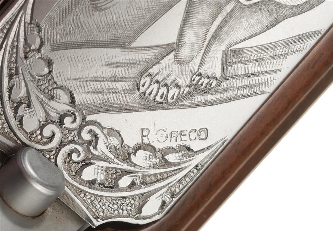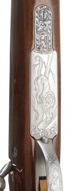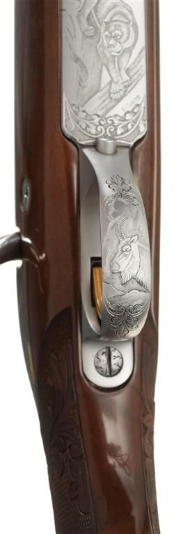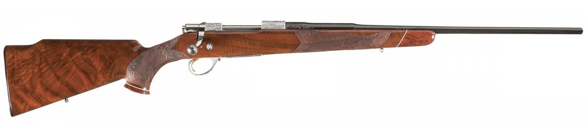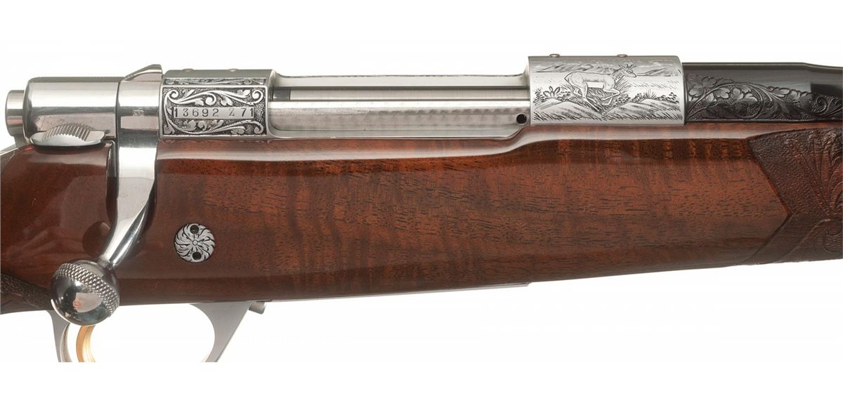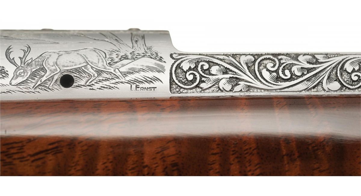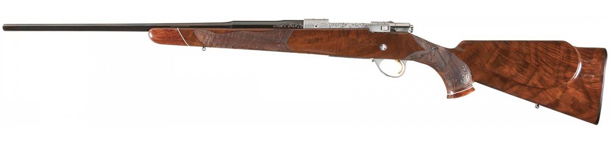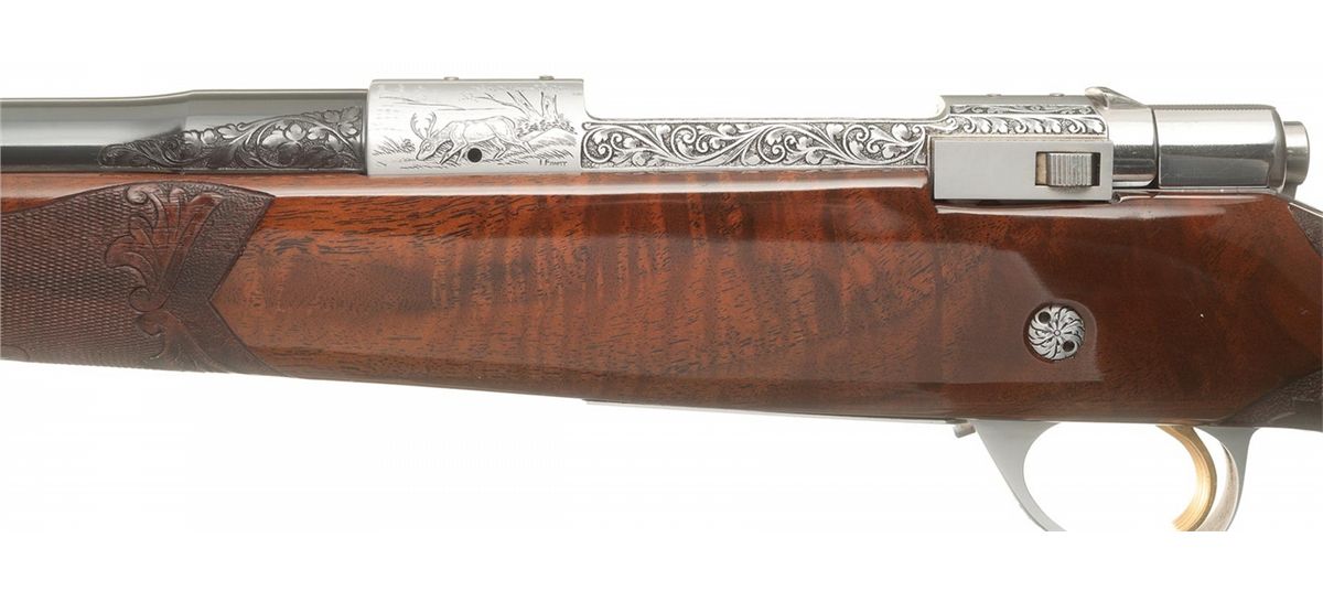 Manufactured in Belgium in 1971, this Olympic Grade medium action rifle features a sporter weight barrel manufactured without sights. The barrel is blue and the remaining metal parts are French grey. The receiver sides are scroll and punch dot engraved. The right side of the receiver ring is engraved with a prong horn antelope in a prairie scene, the left side a feeding buck in a field scene, the hinged floor plate is engraved with a mountain lion in a tree and floral engraving on the hinge assembly and the trigger guard is engraved with a mountain goats head. The left side receiver ring is signed "L ERNST" and the floor plate is signed "R. CRECO". The top receiver rings are factory drilled and tapped for scope/sight mounting. The bolt and follower are polished, the extractor is jeweled and the trigger is gold plated. The stock is deluxe walnut with a high gloss finish, finely checkered and scroll and punch dot carved forearm and pistol grip area with contrasting forend and grip cap with a diamond shaped brass initial plate inset into the grip cap, raised comb and cheekpiece, a black plastic Browning buttplate and sling swivel studs.