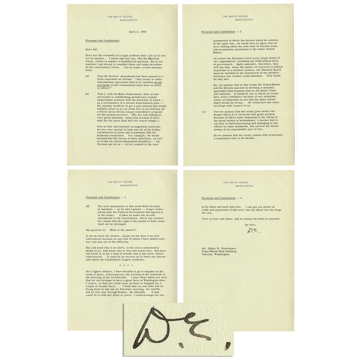 Dwight D. Eisenhower typed letter signed as President, dated 3 April 1956 on ''Personal and Confidential'' White House letterhead. Here, Eisenhower writes to his more conservative brother, Edgar, laying out the unintended consequences of the Bricker Amendment were it to be passed (it ultimately was not). Particularly, Eisenhower envisions the implications it would have on disarmament in Russia, which the President saw as vital. Reads in full: ''Dear Ed: Here are the elements of a legal problem that I put up to you for an opinion. I admit that you can, like the Supreme Court, refuse to answer a hypothetical question, but in my position I am forced to consider these and make decisions on the conclusions I form. Let us make certain assumptions. (a) That the Bricker Amendment has been passed in a form somewhat as follows: 'Any treaty or other international agreement that is in violation of any provision of this Constitution shall have no force or effect.' (b) That I, with the State Department, have at last succeeded in establishing satisfactory mutual inspectional systems with the Russians of which -- as a preliminary to a partial disarmament plan -- the purpose would be to get a plan started that would initially allow us to cut some five to six billions off a thirty-seven billion annual expenditure program for the armed services. (We are now talking in very great amounts; sums that account in their total for far more than half our yearly budget.) Now as this international arrangement proceeds, we are very careful to look into all of the hidden repositories of arms and armaments that we Russians would have. For example, we would demand that the forces of their satellites, as well as of the so-called independent Republics -- the Ukraine and so on -- all be counted in the total armaments to which the Soviets would be entitled. In the same way, we would have to agree that we were talking about the sum total of warlike arms and armaments maintained in the whole United States. Of course the Russians know every single detail of our organization, including our Federalized form of government. Quite naturally, therefore, they will say that, since the matter of reserves is always important to a military system, the National Guard must be included in the framework of the military structure our country could maintain. This would be only fair. So, we assume that in this treaty the United States and the Soviets succeed in devising a mutually agreeable disarmament plan on the basis I have just outlined. It would be one in which we would have every confidence because of our unlimited power of inspection to see that the other fellow didn't break its terms. He would have the same privilege with respect to us. (c) Now we assume that the treaty goes before the Senate where it is received with great acclaim because it offers some beginning to the lifting of the great burden of armaments; a burden that is not only in itself depressing and damaging to our efforts to raise standards, but carries the threat always of an unspeakable type of war. So we assume that the treaty passes with practically a unanimous vote in the Senate. (d) The next assumption is that some State decides to maintain -- at its own expense -- larger armaments than the Federal Government had agreed to in the treaty. It does so under the second amendment to the Constitution, which you remember states that the right of the people to bear arms shall not be infringed. My question is: What is the answer? If you do know the answer, please let me have it at your convenience because no one else to whom I have talked sees any real way out of the difficulty. But I do know that if we don't, in the years immediately ahead of us, find some way to stop this arms race, this poor old world is in for a kind of trouble that it has never before experienced. It could be so serious as to leave any discussion about the Constitution largely academic. On a lighter subject, I have decided to go to Augusta on the ninth of April, returning here the evening of the sixteenth or the morning of the seventeenth. I hope these dates are such that we can arrange to have a game here in Washington after I return, or that you could come down to Augusta for a couple of rounds there. I think that my son John will be flying down to join me on Thursday morning, the twelfth, and he will stay through Sunday, the fifteenth. If that could fit in with any plans of yours, I could arrange for you to fly down and back with him. I can get you plenty of clubs and equipment of that sort, but my shoes are too large for you. Love to Lucy and Janis, and as always the best to yourself...'' Signed boldly, ''D.E.'' Four page letter, measuring 7'' x 10.25'', has expected folds from mailing, else near fine.