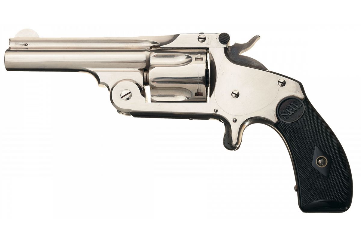 Manufactured from 1877 to 1891, with this particular revolver being manufactured in very early 1877. The top of the barrel rib is marked with the two line address/patent dates with the matching serial number on the butt, barrel, latch and cylinder. Pinned front sight and notch rear sight on the latch, and lanyard on the butt. Fitted with checkered hard rubber grips with S&W in a circle at the top.