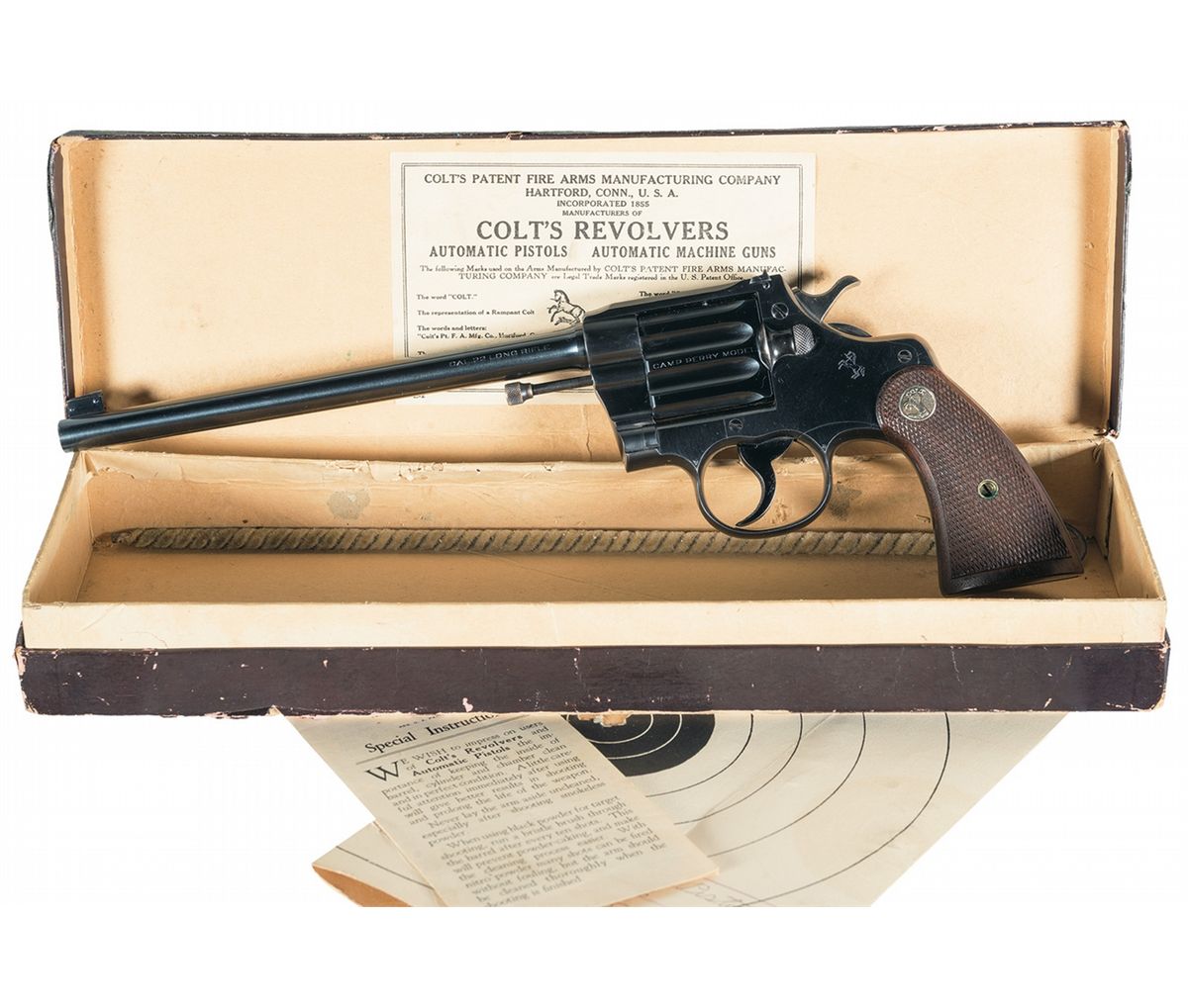 Only 2,525 of these single shot pistols were manufactured between 1920 and 1941. This exceptional example has an elevation adjustable front sight and a windage adjustable rear sight. It has the standard markings and features and is fitted with checkered walnut grips with silver Colt medallions. Comes with the original box numbered to the gun, two extra rear sights, an extra rear sight screw, two extra front sight blades, a screwdriver, a cleaning brush, "Special Instructions" pamphlet and test target numbered to the gun.