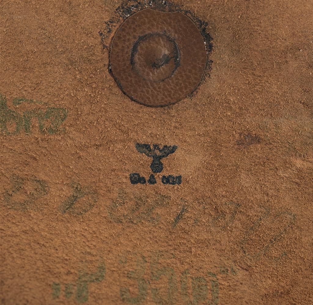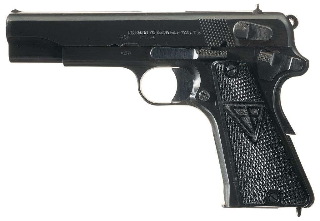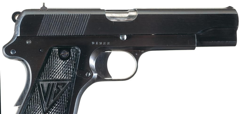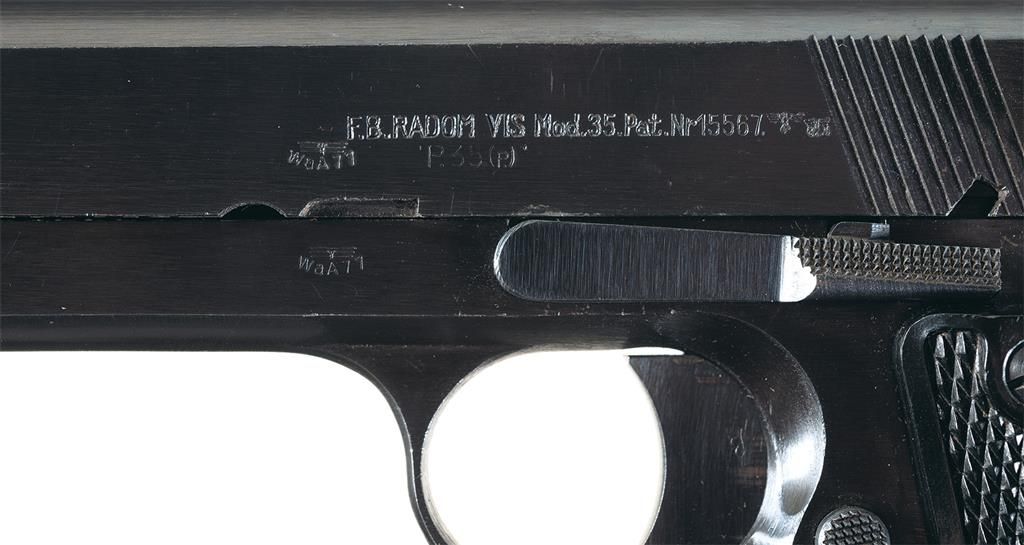 This is a beautiful all original and as issued example of an early WWII Polish Radom pistol rig as brought back by a WWII veteran according to the consignor. This example was produced shortly after the Nazi's captured the Radom factory as it still retains the slotted back strap for a wooden shoulder stock. This pistol has the standard one-line slide markings of "F.B. RADOM VIS Mod 35 Pat. Nr. 15567" followed by a single Eagle firing proof. Below the slide legend it is stamped with "P.35 (P.)", which was the German designation for this pistol and in front of the slide and frame it is stamped with a single "Eagle/WaA 77" Waffenamt proof. Since this is an early production Nazi pistol it has the three levers on the left side with the slotted back strap. The right side of the frame is numbered "D1322" and it is correctly numbered (matching) on the inside of the slide with "D1322" with the left side of the barrel lug stamped "322" followed by a single eagle firing proof and a double "Eagle/WaA623" waffenamt proof. It is fitted with the early black plastic grips with molded in checkering with the "FB" and "VIS" logos on each side of the grips. This beautiful early Radom pistol is complete with both original magazines with the correct double pinned magazine base. The back sides of each magazine is stamped with small single, (unreadable) partial letter proof. This beautiful pistol is complete with an original early brown leather holster that has several ink stamped proofs on the inside of the flap as follows:"bnz/Eagle WaA623/P.35(p.)". There is also an unreadable number or name below the markings. The holster has been dyed a darker brown/cordovan color and has had a small portion of the front body of the holster period cutaway to allow it to be withdrawn easier (later produced Radom holsters were all made with this cut away design).