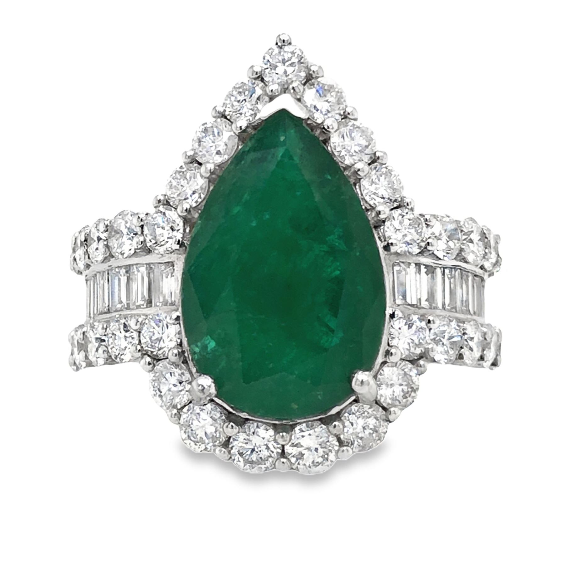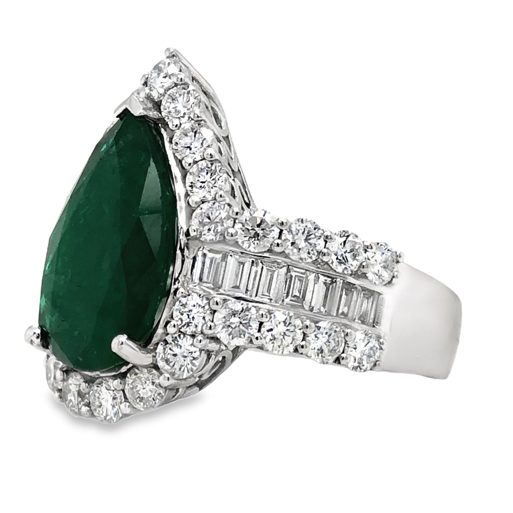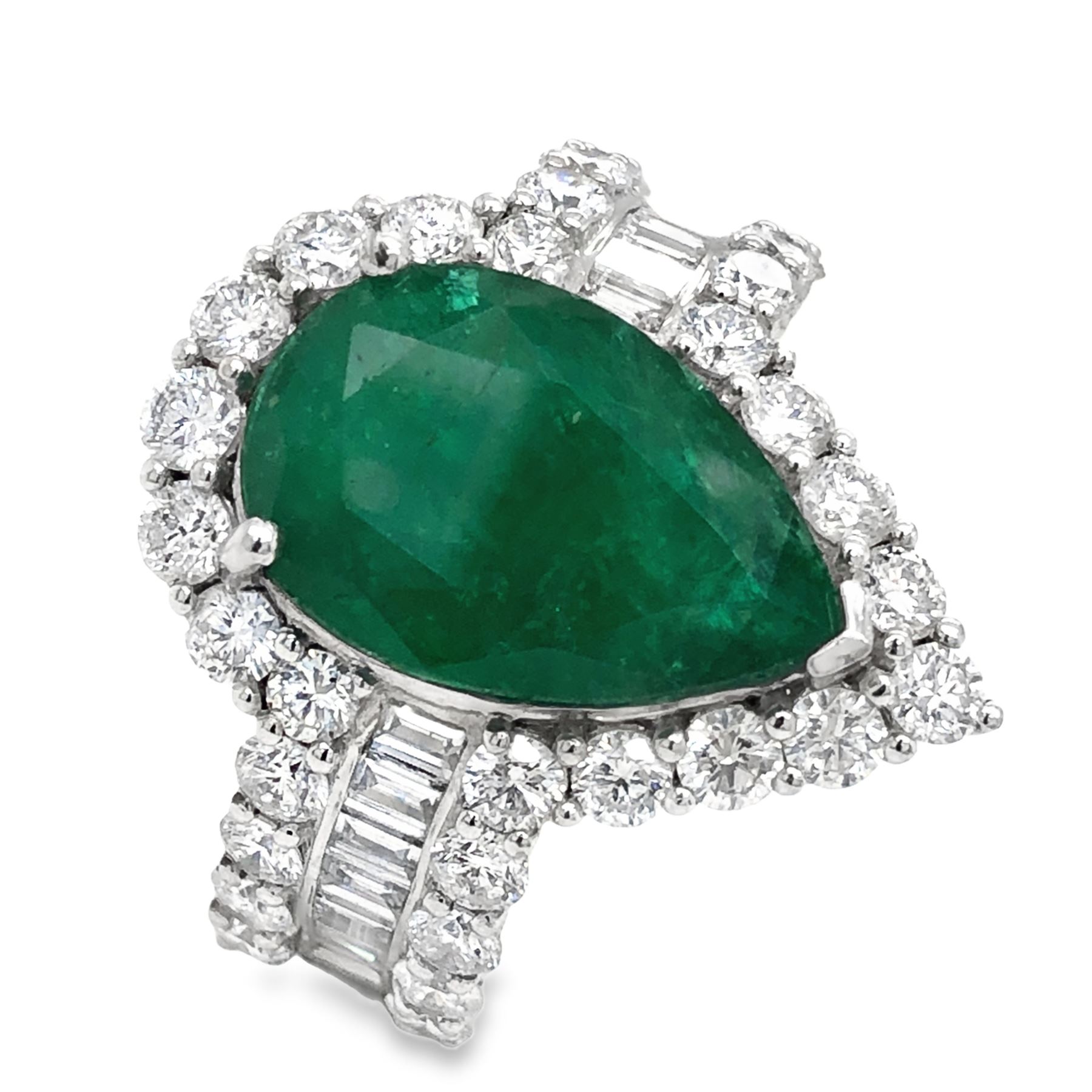 DESCRIPTION DETAIL: This stunning ring features a large pear shaped Emerald set among baguette and round brilliant cut natural Diamonds in Platinum.