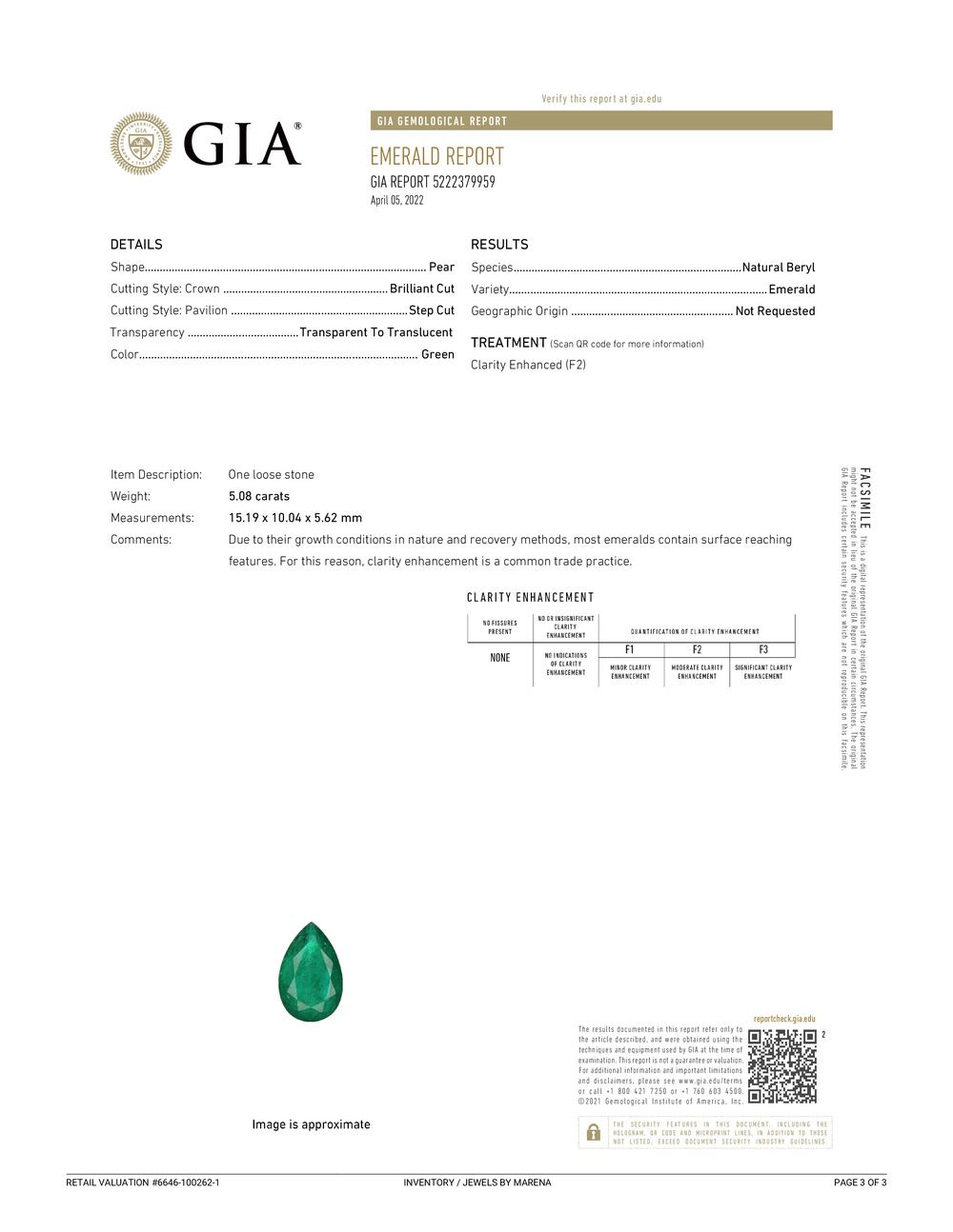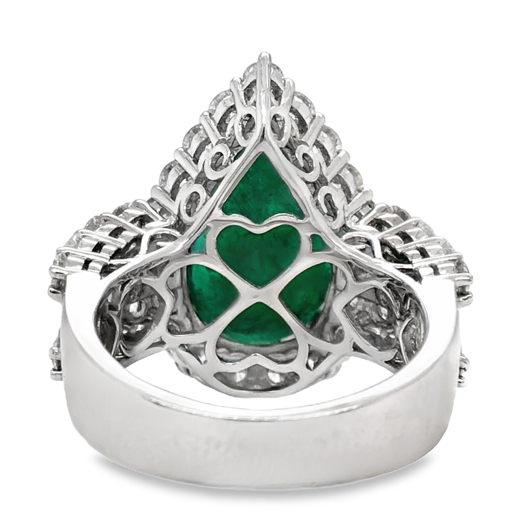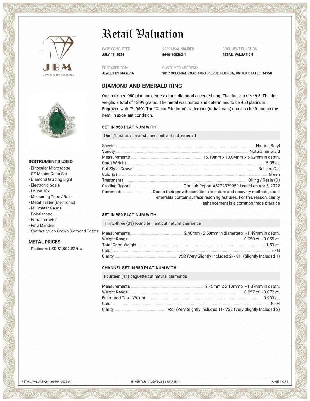 DESCRIPTION DETAIL: This stunning ring features a large pear shaped Emerald set among baguette and round brilliant cut natural Diamonds in Platinum.