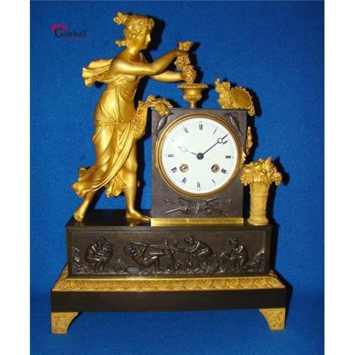 THE ULTIMATE IN FUNCTION AND BEAUTY!!We are very proud to offer you this amazing Empire bronze gilt mantel clock that dates from the third quarter of the 19th C. (c. 1855).The original gilding is in superior condition with just the right color and patina!!The clock case is made of the finest bronze with two different colors,gilt bronze and bronze with a gorgeous brown patina.On the top of the clock is a very fine figure represent Demeter, the Goddess of Harvest,who is compressing grapes.Below there is a representation of several playing cherubs.This is the most wonderful mantel clock you will ever find in this fantastic condition!The porcelain dial with the Roman numurals and the original steel hands is gorgeous.The clock is provided with original pendulum and key. Perfect running and striking condition with 8 days going work and the 1/1 and 1/2 hours striking on a silvered bronze bell.The movement is cleanded by an official clock maker and is driving on a silk suspension,is in wonderful condition, run reliably and keep accurate time.The bronze movement is stamped on the back with:" F.C." and probably made by Fredrique Casteau a very famous clockmaker in that time.The glass before the dial and in the back are bent and beveled.We acquired this marvelous Empire clock from a French estate in the South of France near Cannes.The dimensions are: Height: 15 Inches,Width: 11,5 Inches and Dept: 4,5 Inches.Regarding shipping we will pack this clock in a wooden box so you will receive it ...