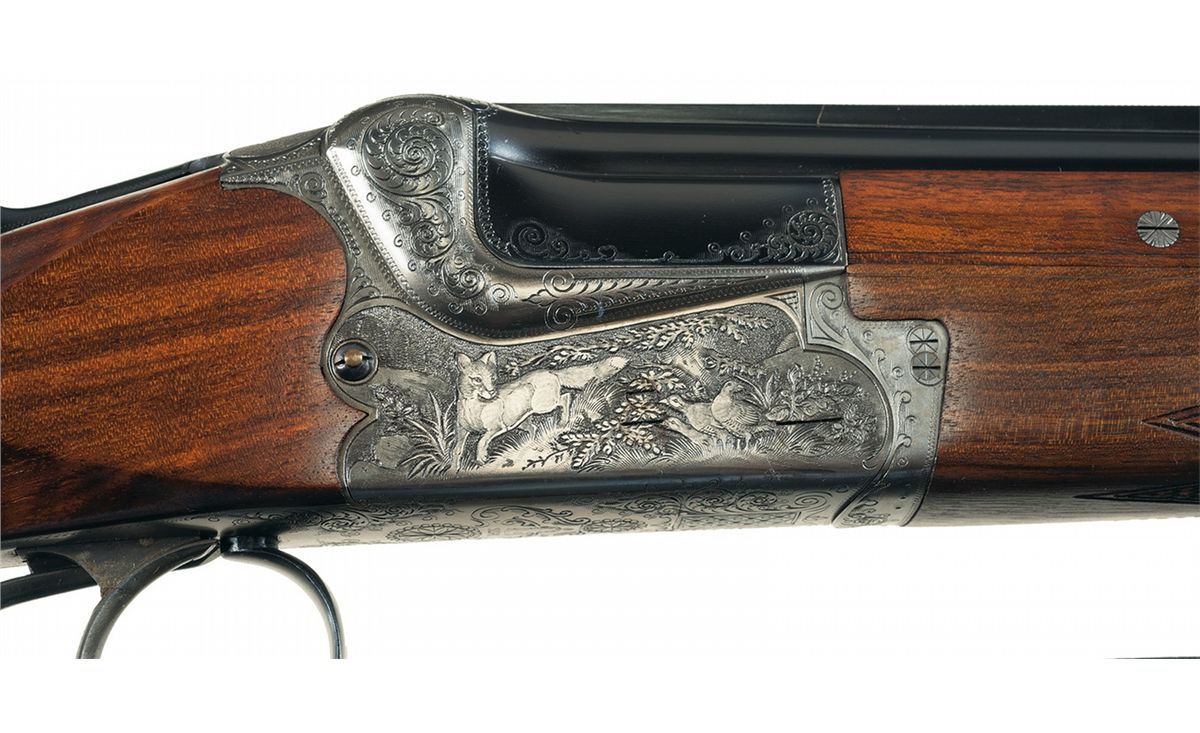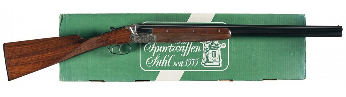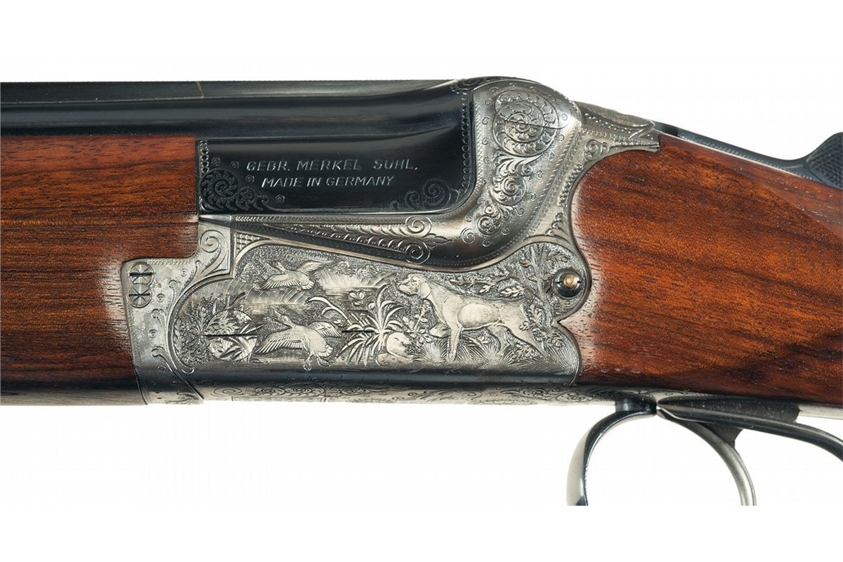 Single bead sight on the solid matte rib. 3 inch chambers, choked extra full/extra full with ejectors. The left side of the action is relief engraved with a hunting dog scaring up two ducks in a marsh scene and the right side has a fox and three quail in a wooded scene. The balance of the action, the trigger guard and break lever are engraved with a floral scroll design. The underside of the action is marked with the "SUHL" logo. The left rear of the barrels are marked "GEBR. MERKEL SUHL/MADE IN GERMANY". Double triggers, tang mounted manual safety, cocking indicators and mounted with a multi-point checkered three-piece walnut forearm and straight grip stock with a serrated Merkel buttplate. Length of pull is 14 1/2 inches. Comes with the original box numbered to the gun.