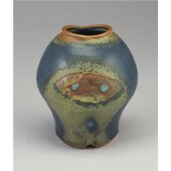 Exceptional FONG CHOW stoneware vessel with dimpled sides and diamond motif in blue and celadon microcrystalline glazes. Incised FONG CHOW with artist cipher. 10" x 7 1/2" $1,500 - 2,000