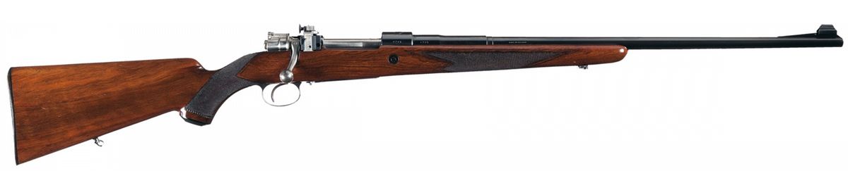 Manufactured in Belgium. Belgian proofs on this rifle are stamped under the caliber marking on the rear left side of the barrel and on the left side of the receiver ring. The left receiver side wall has the FN address and the left side of the barrel is marked "CHROME VANADIUM STEEL." The top of the receiver ring has the "FN" monogram. The rifle is equipped with a hooded ramp front sight and an Armstrong dual-range sight. The bolt is bright with the remaining surfaces blue. Mounted with a nicely figured pistol grip stock with checkered forearm and grip area, sling swivels and serrated horn buttplate with the FN monogram.