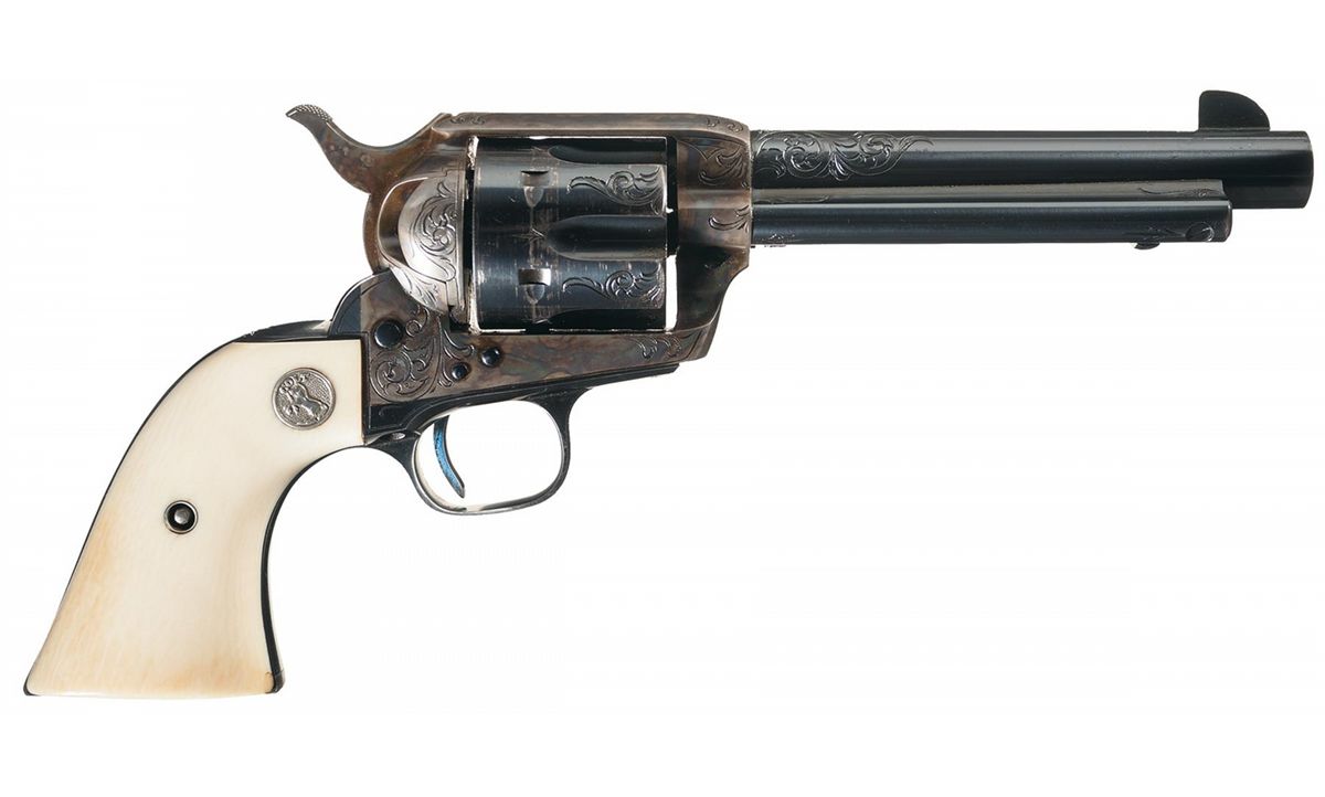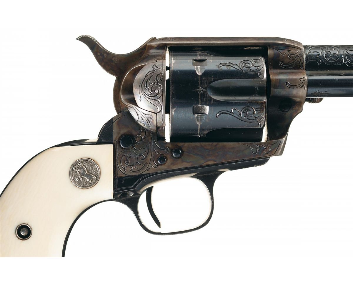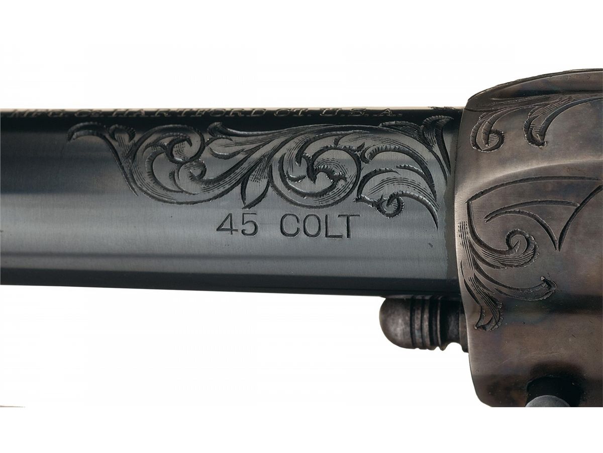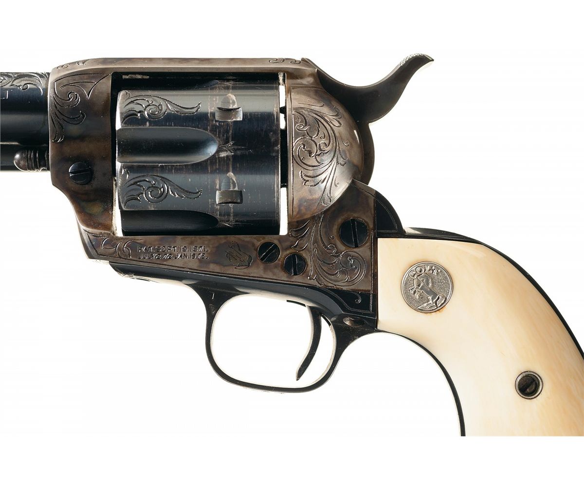 Factory engraved Colt Single Action Army Revolver manufactured in 1929. The revolver is decorated with Colt Grade A scroll engraving executed by Master Engraver Wilbur A. Glahn. The understated and superbly executed scroll work is present on the barrel, ejector housing, frame, cylinder chambers, trigger guard and back strap. Blue finish on the barrel, cylinder, trigger guard and back strap. The frame and hammer are casehardened. The revolver is fitted with two piece factory ivory grips and German silver Colt medallions. The top of the barrel has the one line address "COLT'S PT. F.A. MFG. Co. HARTFORD, CT. U.S.A." The left side of the revolver barrel is marked with the caliber "45 Colt". The left side of the frame has the Colt two line, three patent dates followed by the Rampant Colt. The assembly mark "A'' and the Colt "VP/Triangle" proofmark are stamped on the left front trigger guard bow. The matching serial number is stamped on the underside of the frame and right side of the grip straps under the grip and the matching assembly number is marked in the right rear of the frame and on loading gate.