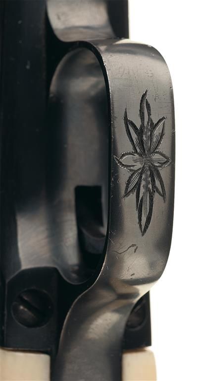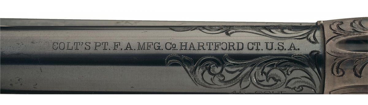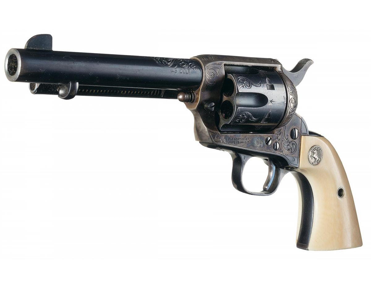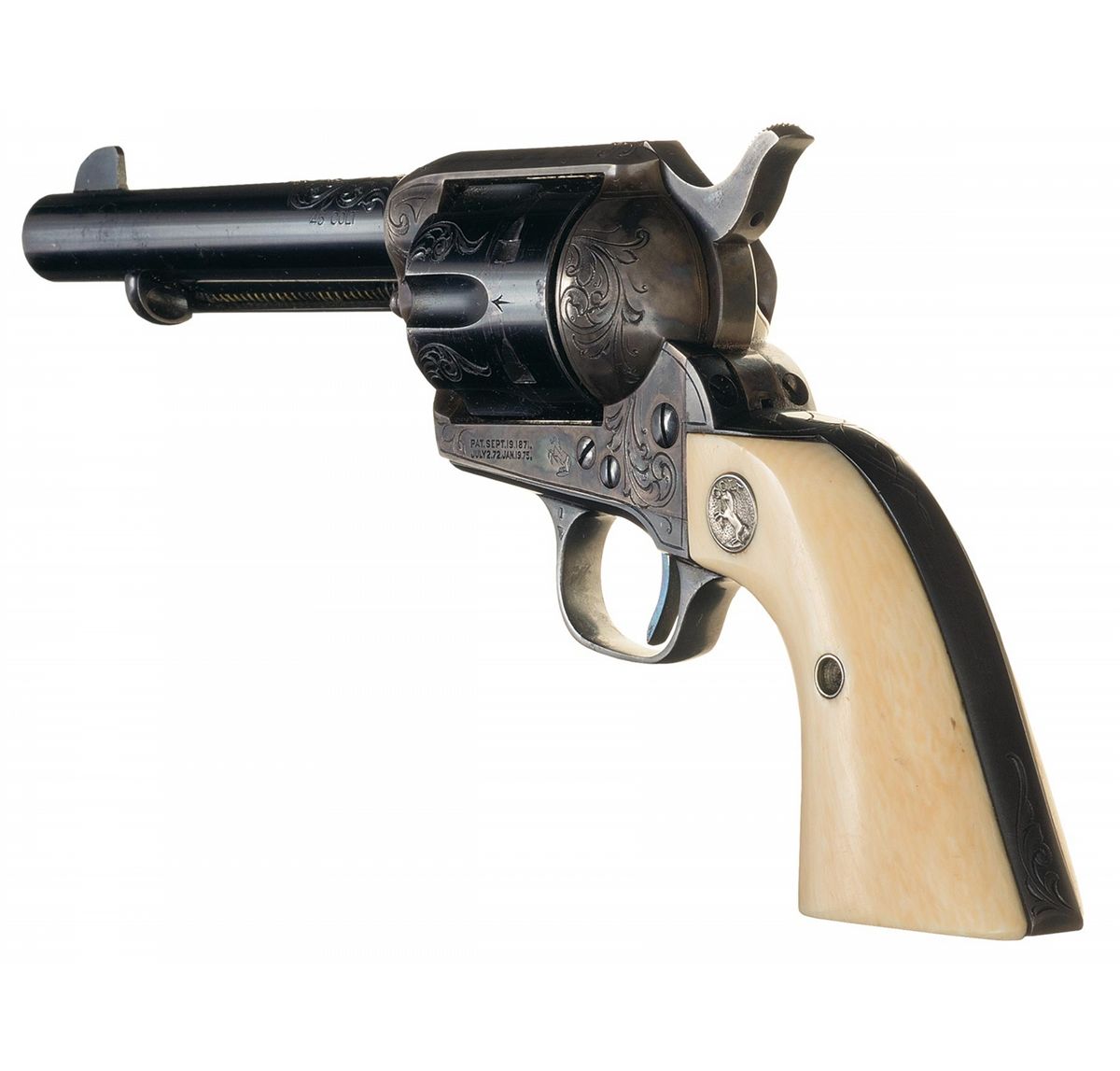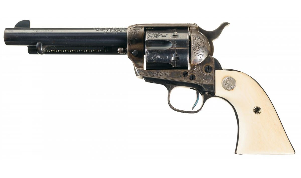 Factory engraved Colt Single Action Army Revolver manufactured in 1929. The revolver is decorated with Colt Grade A scroll engraving executed by Master Engraver Wilbur A. Glahn. The understated and superbly executed scroll work is present on the barrel, ejector housing, frame, cylinder chambers, trigger guard and back strap. Blue finish on the barrel, cylinder, trigger guard and back strap. The frame and hammer are casehardened. The revolver is fitted with two piece factory ivory grips and German silver Colt medallions. The top of the barrel has the one line address "COLT'S PT. F.A. MFG. Co. HARTFORD, CT. U.S.A." The left side of the revolver barrel is marked with the caliber "45 Colt". The left side of the frame has the Colt two line, three patent dates followed by the Rampant Colt. The assembly mark "A'' and the Colt "VP/Triangle" proofmark are stamped on the left front trigger guard bow. The matching serial number is stamped on the underside of the frame and right side of the grip straps under the grip and the matching assembly number is marked in the right rear of the frame and on loading gate.