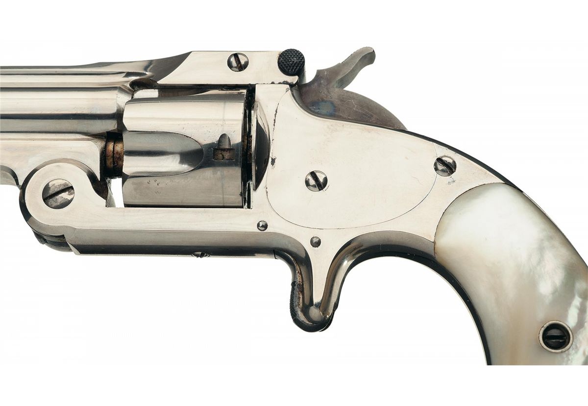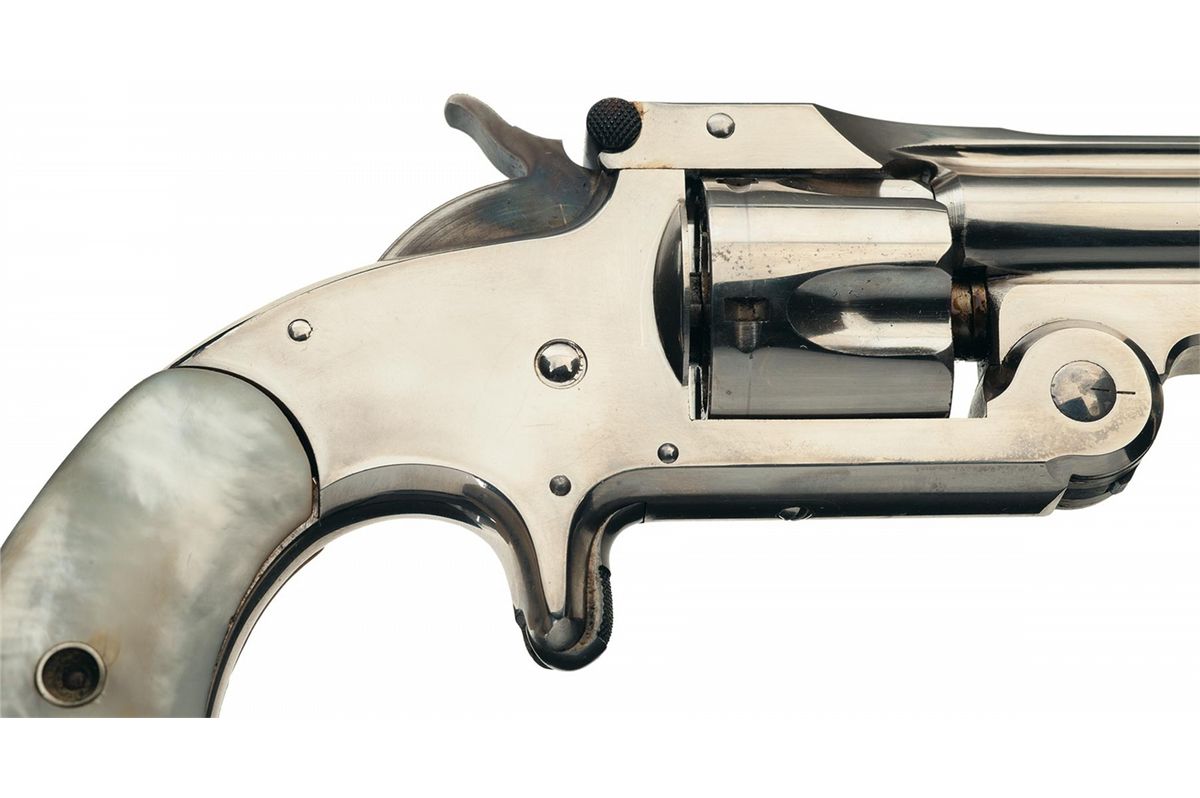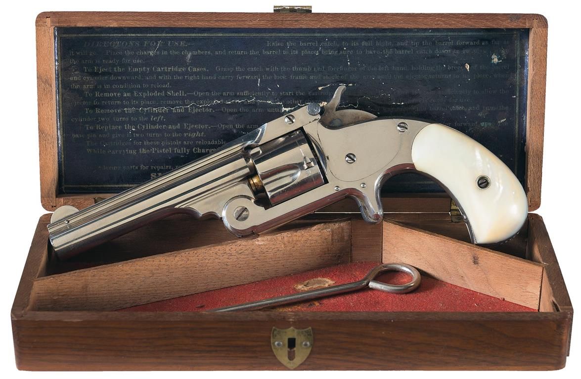 Manufactured from 1878 to 1892 this example has pearl grips. Nickel finish with pinned front sight and notch rear sight on the latch. The two line address patent date marking is stamped on top of the barrel rib and V-shaped patent markings on the top strap. Matching serial number also on the butt, cylinder, latch and barrel. The original factory varnished mahogany partitioned case has a S&W directions label on the inside of the lid. The case also holds a steel cleaning rod.