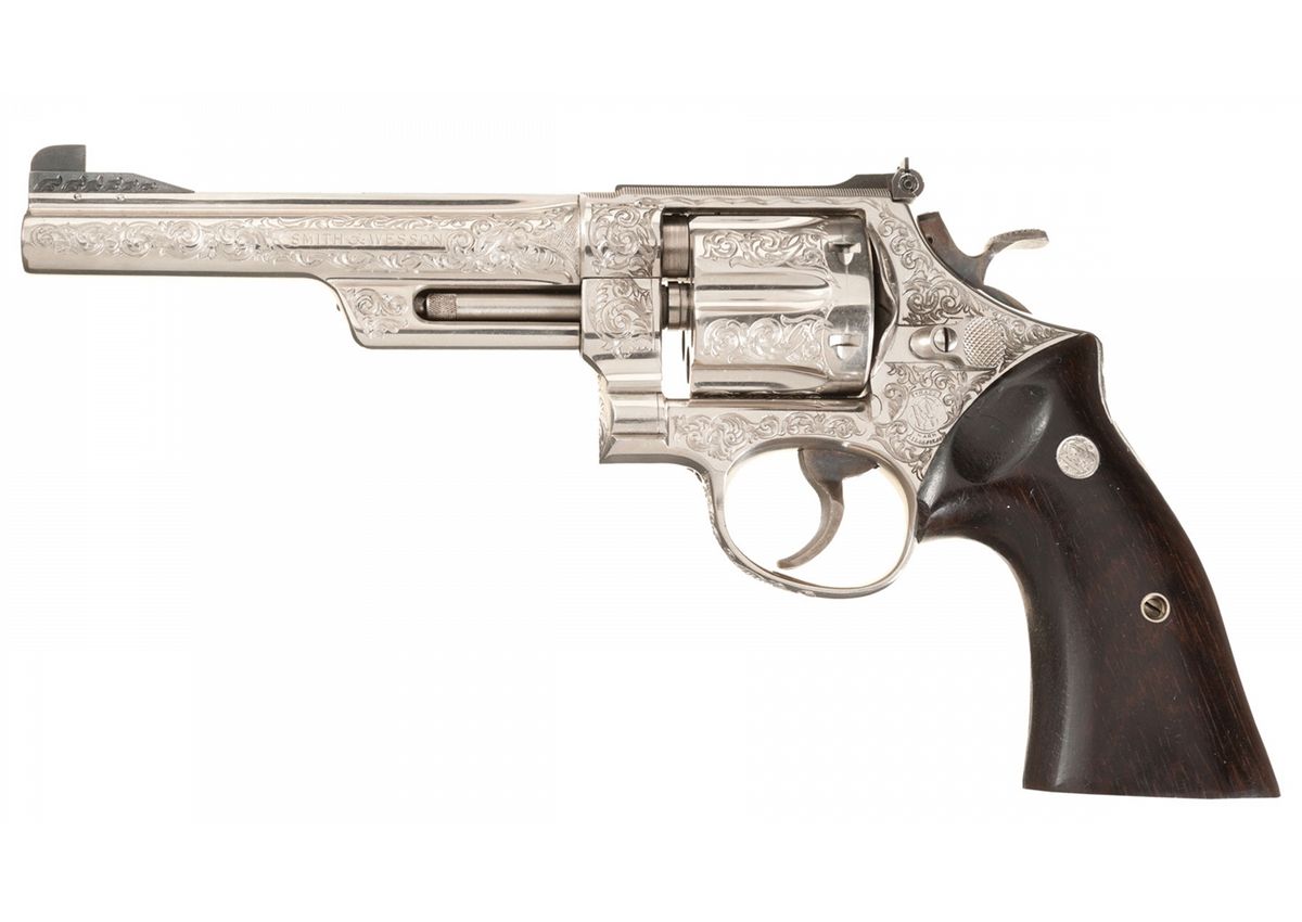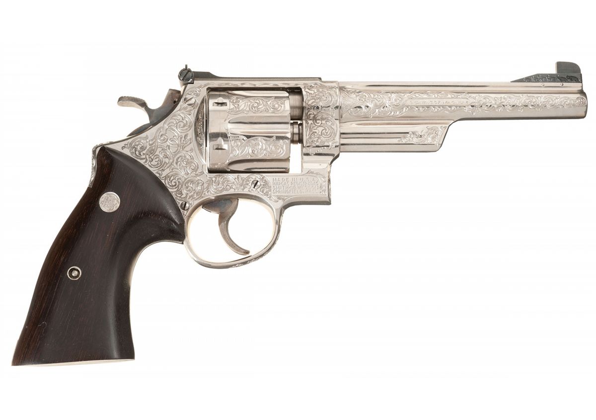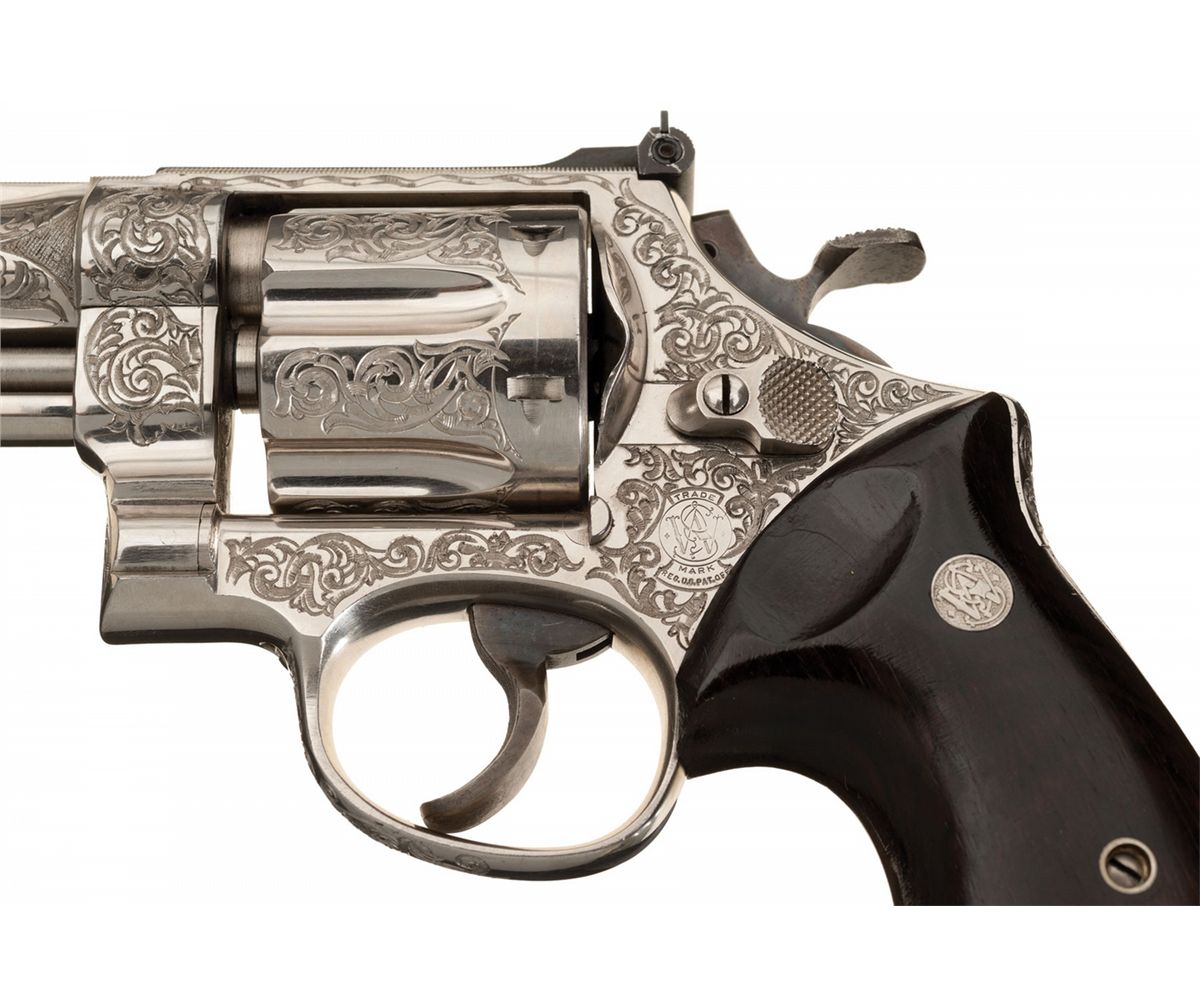 Manufactured circa 1956-57, this is a beautiful example of a 1950’s factory engraved N-frame revolver. This revolver, built on the five-screw frame, has "Class A" coverage of deep floral scroll engraving with a matte background that covers the sides of the frame, cylinder flats, the front portion of the trigger guard bow, front sides of the ejector housing and the full length of both sides of the barrel. A factory letter accompanies this revolver, stating that it was engraved by Russell Smith, S&W’s Master Engraver at the time, and shipped to Warshal’s Sporting Goods, Seattle, WA on November 26, 1956. The letter also verifies the 6 inch barrel, nickel finish, target hammer and rosewood target grips at the time of shipment. Also included is a signed letter from Russell Smith, dated Sept. 1, 1993, referencing the serial number and attesting to his having engraved this revolver. It has the standard S&W markings on the frame and barrel with the caliber designation of "S&W .357 MAGNUM" on the right side of the barrel. Ramped Patridge target front sight and adjustable white outline target rear with casehardened target hammer and trigger, and is fitted with rosewood target grips.