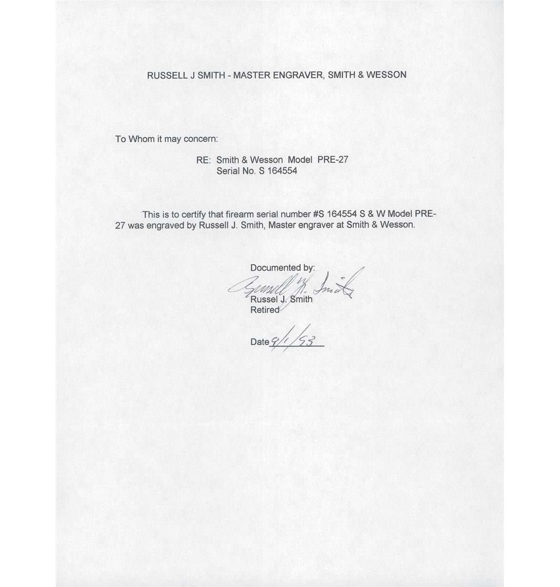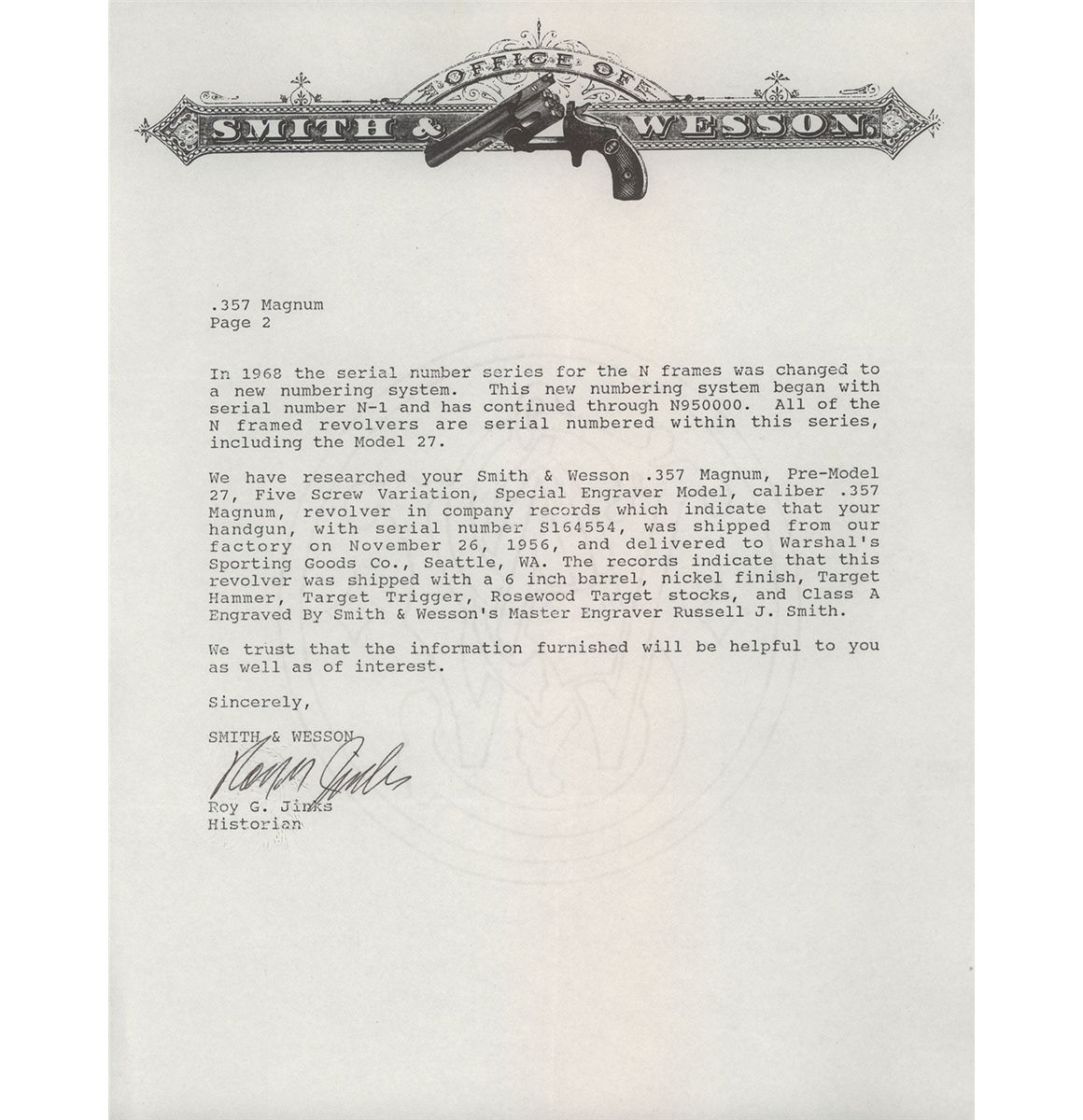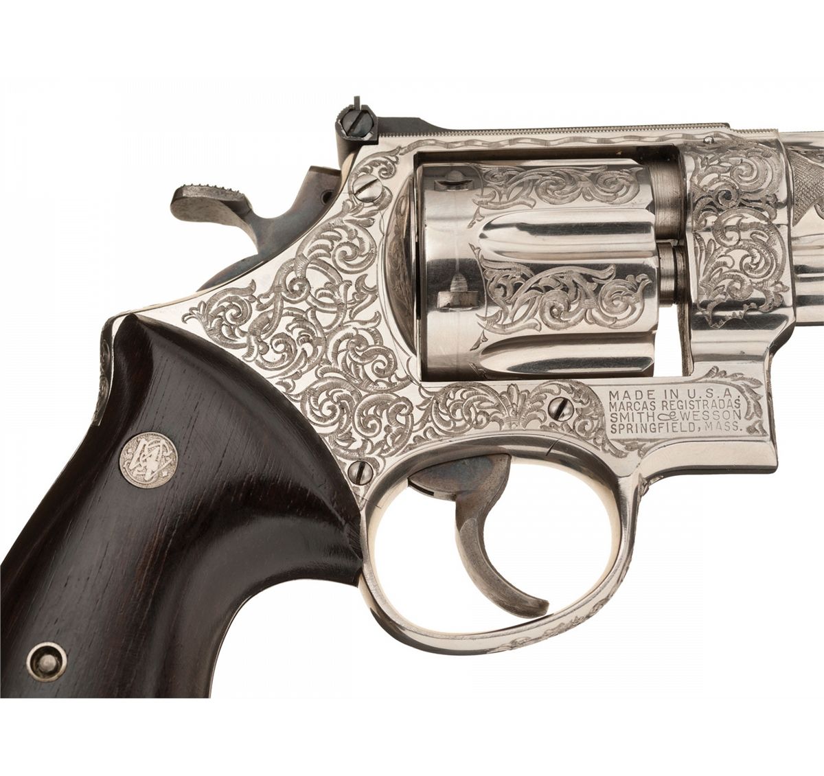 Manufactured circa 1956-57, this is a beautiful example of a 1950’s factory engraved N-frame revolver. This revolver, built on the five-screw frame, has "Class A" coverage of deep floral scroll engraving with a matte background that covers the sides of the frame, cylinder flats, the front portion of the trigger guard bow, front sides of the ejector housing and the full length of both sides of the barrel. A factory letter accompanies this revolver, stating that it was engraved by Russell Smith, S&W’s Master Engraver at the time, and shipped to Warshal’s Sporting Goods, Seattle, WA on November 26, 1956. The letter also verifies the 6 inch barrel, nickel finish, target hammer and rosewood target grips at the time of shipment. Also included is a signed letter from Russell Smith, dated Sept. 1, 1993, referencing the serial number and attesting to his having engraved this revolver. It has the standard S&W markings on the frame and barrel with the caliber designation of "S&W .357 MAGNUM" on the right side of the barrel. Ramped Patridge target front sight and adjustable white outline target rear with casehardened target hammer and trigger, and is fitted with rosewood target grips.