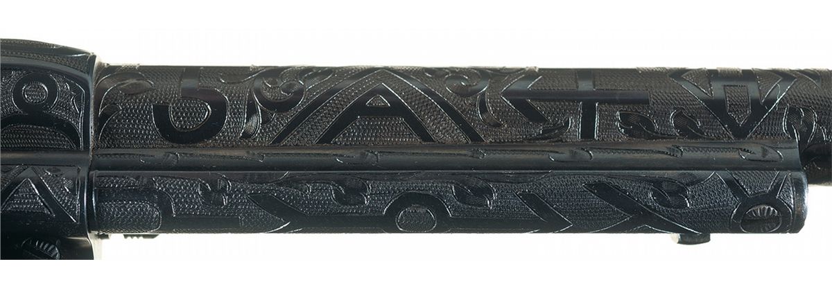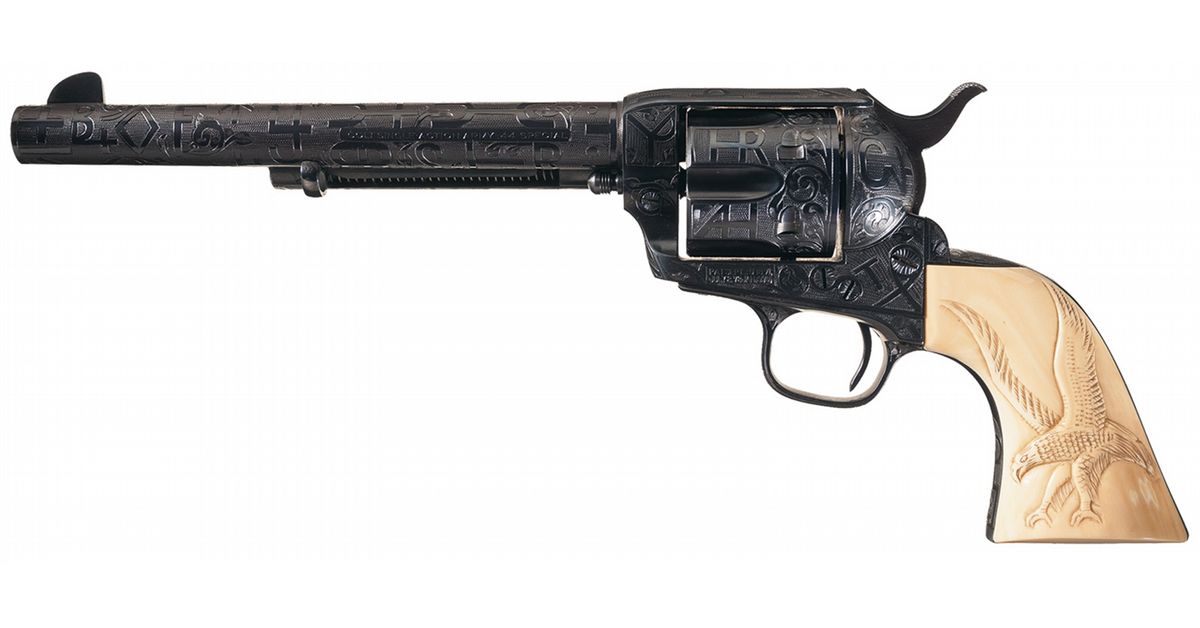 This is a fabulous example of a first generation Colt Single Action Army revolver manufactured in 1920 that was subsequently custom engraved and embellished in the traditional "Texas Cattlebrand" pattern pioneered by Cole Agee and carried on by Weldon Bledsoe. This revolver is an absolute match to another Colt SAA that is also listed in this auction. This was an extremely rare and highly desirable pattern developed in the 1940s that depicted all the of more prominent and historic Texas cattle brand used in the 1880s and early 1900s. The engraving pattern covers 95% of the revolver in the typical western style with the recognizable "Lazy 2 P", "XIT" and many other famous Texas brands. All the engraving has a punch dot background. The only surfaces not covered are the upper portion of the front strap, the inside area of the trigger guard and the cylinder flutes. The sides of the trigger guard bow, the inside of the ejector rod housing and the sighting groove on the top strap are engraved with a fine zigzag pattern. The top of the barrel has the single Colt factory address, with "COLT SINGLE ACTION ARMY 44 SPECIAL" marked on the left side of the barrel. The left side of the frame is marked with the two line, three patent date marking with the Rampant Colt trademark behind the markings. In the refinishing/engraving the revolver, the serial number on the grip strap and back strap have been removed or engraved over. The revolver is fitted with a beautiful set of one-piece ivory grips with a large carved Eagle on each side.
