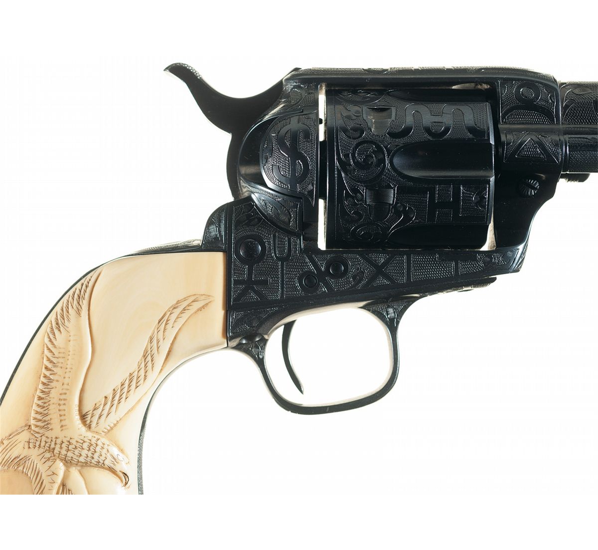 Exceptional First Generation Colt Single Action Army Engraved in the Cole Agee Style Cattlebrand Pattern with Carved Ivory Grips